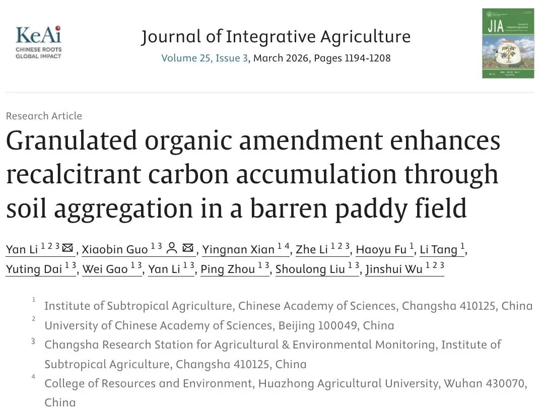 Yan Li, Xiaobin Guo, Yingnan Xian, Zhe Li, Haoyu Fu, Li Tang, Yuting Dai, Wei Gao, Yan Li, Ping Zhou, Shoulong Liu, Jinshui Wu. 2026. Granulated organic amendment enhances recalcitrant carbon accumulation through soil aggregation in a barren paddy field. Journal of Integrative Agriculture, 25(3): 1194-1208.