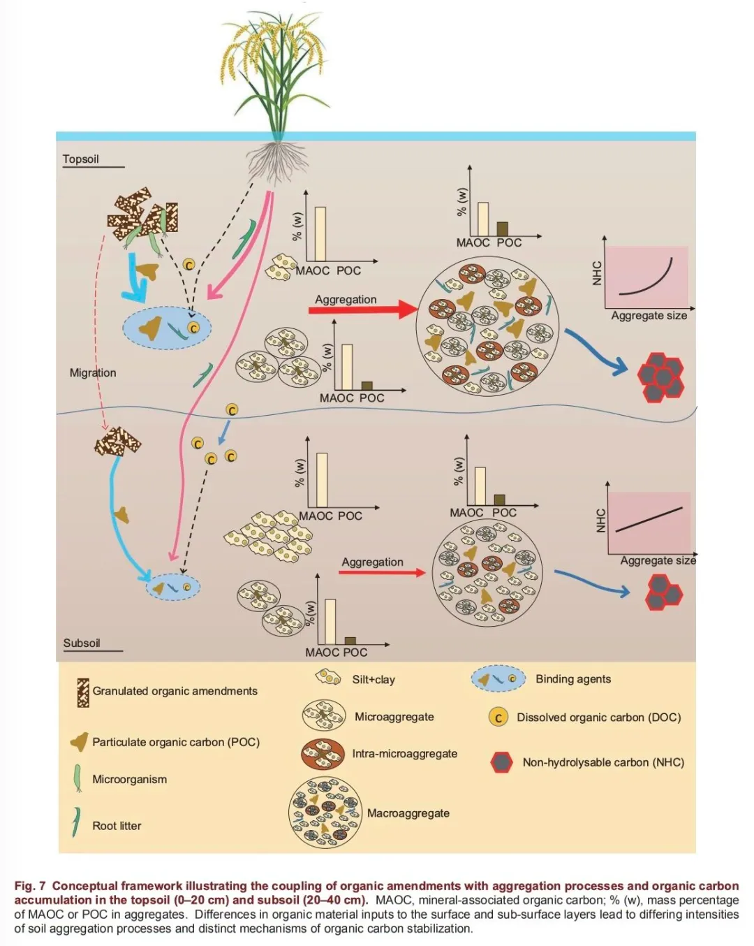 该研究表明40 t ha-1颗粒化有机物料被证实是改善贫瘠稻田土壤理化结构、提升SOC含量并增强碳稳定性的有效策略,尤其对0–20 cm表层的快速培肥与固碳具有优势。该成果为作物秸秆资源高值利用与贫瘠稻田耕层质量提升提供了创新视角与可操作的管理方案。