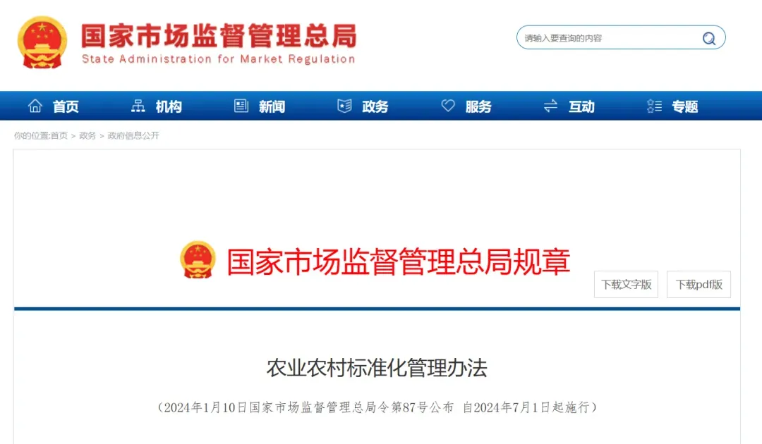 为充分发挥标准化在农业农村现代化建设中的基础性、引领性作用,市场监管总局近日修订出台了《农业农村标准化管理办法》,将于2024年7月1日起正式施行。