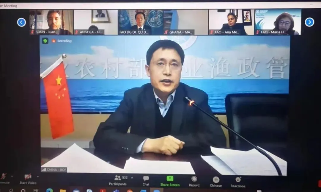 刘新中表示,1995年联合国粮农组织第28届大会审议通过《负责任渔业行为守则》及相关决议后,中国政府秉承负责任精神,走出一条中国特色的负责任渔业和水产养殖发展道路。中国政府高度重视渔业资源养护,结合中国国情,组织实施了捕捞渔民减船转产、海洋伏季休渔、长江禁渔、资源增殖放流和海洋牧场建设等一系列资源养护措施,促进渔业可持续发展。中国政府大力推动“以养为主”的产业发展方针,到2020年水产养殖产量占水产品总产量的80%,不仅解决了“吃鱼难”问题,还增加了收入,促进了脱贫,带动了就业。中国政府先后加入10个国际或区域渔业管理组织,参与30多个涉渔国际组织活动,加强与重要渔业国家对话交流,加大对发展中国家的合作帮助,为全球渔业可持续发展发挥重要作用。
