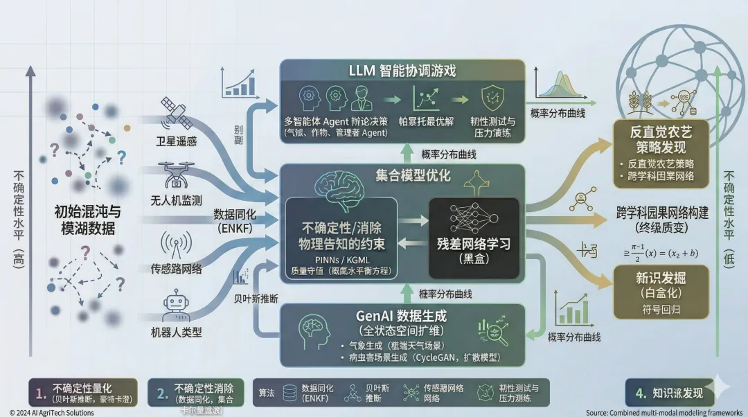 底层引擎就绪后,系统需要一个能理解全局的“中央大脑”。在虚拟数字农田中,LLM 赋予了生态系统各个组件以“智能体(Agent)”的身份(气候 Agent、作物 Agent、微生物 Agent),让它们进行高频博弈。系统不再输出单一的“预测产量”,而是输出量化了所有不确定性的概率分布图,以评估系统的“韧性”。