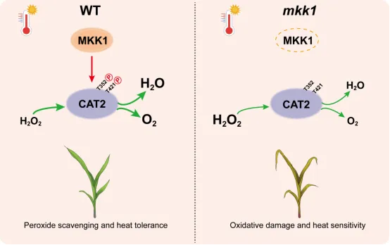 该研究首次在玉米中鉴定到一个关键的耐热正向调控因子ZmMKK1。研究表明,ZmMKK1功能缺失突变体对热胁迫高度敏感,而过表达该基因则能显著增强植株耐热性。深入机制解析发现,热胁迫可快速激活ZmMKK1,使其直接与过氧化氢酶ZmCAT2互作,并磷酸化其第352和421位苏氨酸。这一磷酸化修饰直接增强了ZmCAT2的酶活性,从而加速清除热胁迫积累的过氧化氢(H₂O₂),维持细胞活性氧稳态,最终提升玉米耐热性。