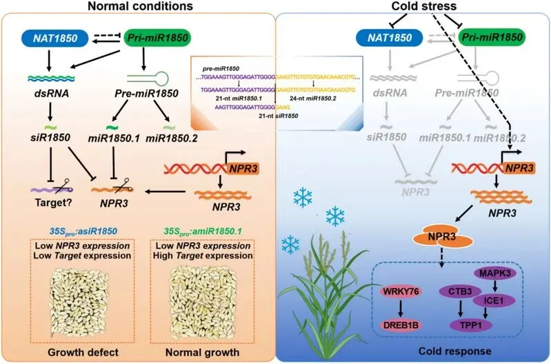 前期研究发现,水稻中一个特有的miRNA—miR1850.1,通过靶向抑制免疫应答因子NPR3的表达,调控水稻耐冷性。在此基础上,该研究鉴定到与miR1850.1的前体pri-miR1850完全重叠的反义转录本—NAT1850,并证实二者存在相互调控关系。进一步研究发现,NAT1850与pri-miR1850形成的双链RNA可在细胞质中被加工,产生一个21nt的小干扰RNA—siR1850。分子与遗传实验证明siR1850能够负向调控水稻的耐冷性。在作用机制上,研究发现siR1850与来源于pr-miR1850的miR1850.1共同靶向并切割同一个耐冷正调控基因NPR3的mRNA。进一步的机制解析揭示,NPR3能够作为转录共激活子,与转录因子WRKY76互作,共同激活下游核心耐冷基因DREB1B的表达,从而启动水稻的低温胁迫应答。