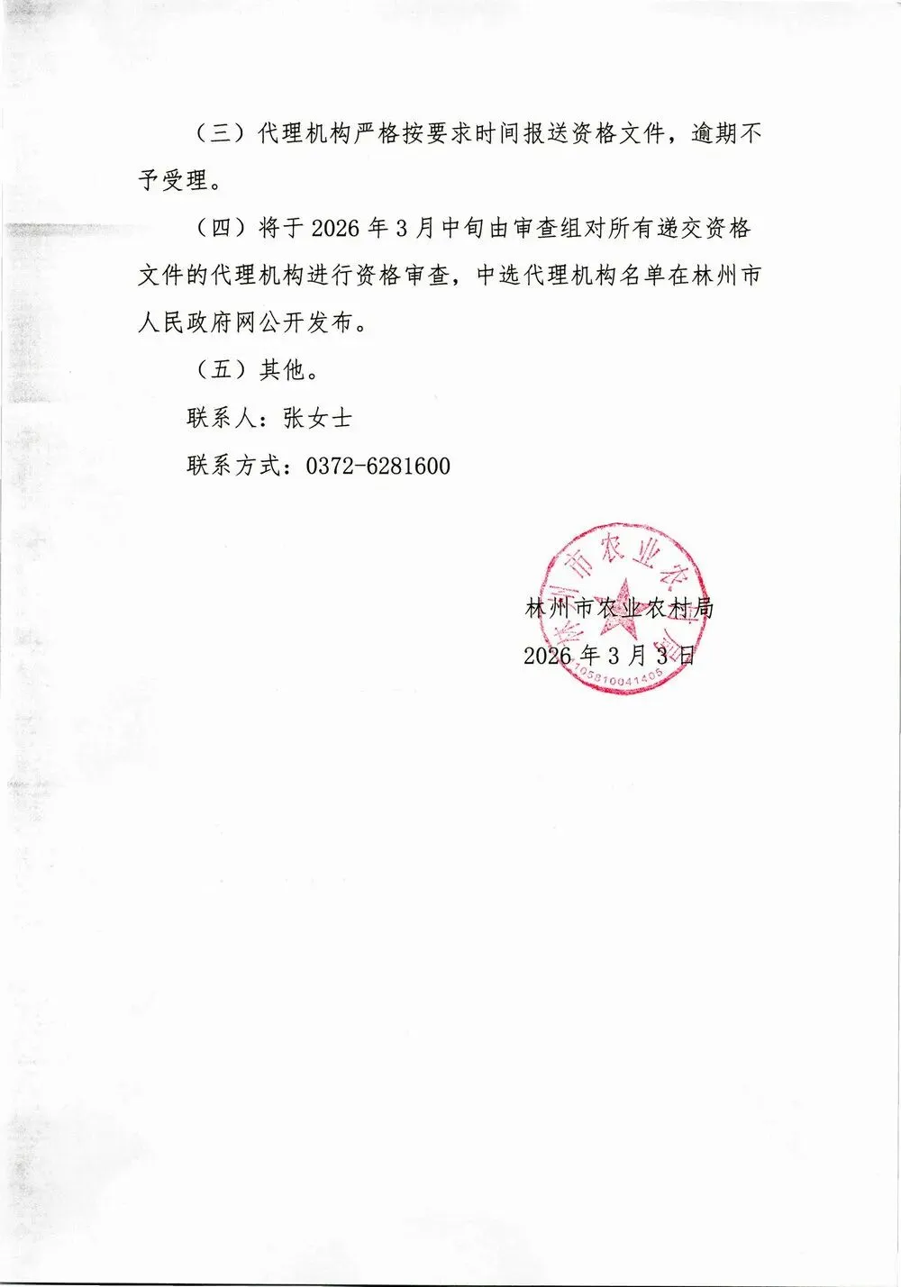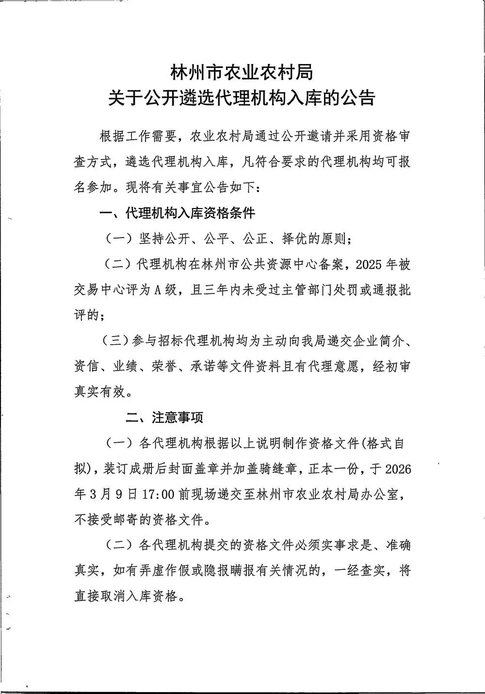 >林州市农业农村局关于公开遴选代理机构入库的公告