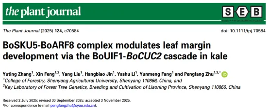 沈阳农业大学祝朋芳教授团队长期从事羽衣甘蓝重要性状功能基因的研究,在羽衣甘蓝叶形性状方面,证实了BoALG10基因在维持叶缘全缘形态中的重要功能(Feng et al., 2020, Theoretical and Applied Genetics;Feng et al., 2022, Horticulture Research)。此次研究进一步鉴定出位于BoALG10下游参与叶缘发育的功能蛋白BoSKU5,构建了BoSKU5/BoARF8-BoUIF1-BoCUC2三层调控模块。在羽衣甘蓝其他重要经济性状方面,团队挖掘到了控制粉色叶性状的功能基因BoDFR1(Feng et al., 2021;Zhang et al., 2022, Theoretical and Applied Genetics),并解析了响应强光和低温转色的分子机制(Liu et al., 2024, The Plant Journal;Liu et al., 2024, Plant Physiology and Biochemistry);揭示了羽衣甘蓝蜡质合成功能基因BoORP3a的作用机理(Zhang et al., 2022, Horticulture Research);明确了羽衣甘蓝株高相关基因BoFHY1的生物学功能(Huo et al., 2025, Plant Physiology and Biochemistry)。目前,团队自主选育的羽衣甘蓝F1杂交新品种已推广应用。论文第一作者为沈阳农业大学林学院在读博士生张雨婷,通讯作者为沈阳农业大学林学院祝朋芳教授。青年教师冯馨以及团队研究生刘洋、金航标、李亚殊、方蕴蒙也参与了此项工作。该研究得到了国家自然科学基金(32171850和32471945)的资助。