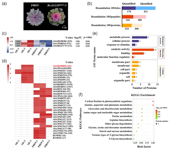 N-糖基化是植物中常见的蛋白质翻译后修饰,其中脂质连接寡糖(lipid linked oligosaccharide,LLO)在内质网中逐步装配形成完整的N-糖链前体。在LLO生物合成的最后阶段,α-1,2葡萄糖基转移酶(alpha-1,2 glucosyltransferase,ALG10)负责向寡糖链末端添加最后一个葡萄糖分子,ALG10功能缺失会破坏N-糖基化途径的正常进行并导致拟南芥叶片发育异常。在先前的工作中,研究人员已经证实BoALG10是控制羽衣甘蓝全缘叶性状的关键基因。在此次研究中,对BoALG10S0835-3过表达株系和裂叶野生型‘F0819’进行了N-糖基化蛋白质组学分析,发现BoSKU5蛋白在BoALG10S0835-3过表达株系中特异性发生了N-糖基化。此外,BoSKU5只有一个N-糖基化位点Asn-444在BoALG10S0835-3和‘F0819’之间表现出定量差异,表明该位点可能对BoSKU5的N-糖基化修饰具有重要影响。图1 BoALG10S0835-3过表达株系与野生型‘F0819’的N-糖蛋白质组学分析