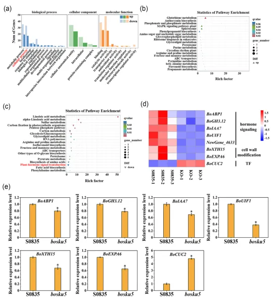 利用bosku5突变体进行转录组测序,共鉴定出222个差异表达基因(DEGs),其中包括99个上调DEGs和123个下调DEGs。GO分析表明,DEGs主要与“代谢过程”、“细胞过程”和“催化活性”相关。对于KEGG通路分析,“谷胱甘肽代谢”和“植物MAPK信号通路”包含的上调DEGs数量最多,而“植物激素信号转导”和“碳代谢”包含的下调DEGs数量最多。与野生型‘S0835’相比,生长素信号通路相关基因BoABP1,BoGH3.12,BoIAA7,BoUIF1以及细胞壁修饰相关基因BoXTH15和BoEXPA6在bosku5突变体中的表达水平显著下调。此外,一个已知的叶缘锯齿形成正调控因子BoCUC2在突变体中的表达水平显著上调。图4 bosku5突变体与野生型‘S0835’的转录组分析