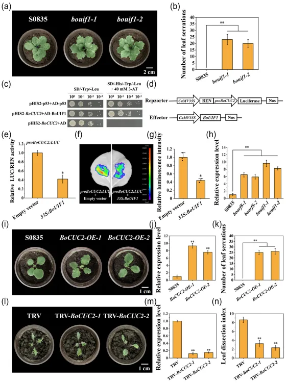 与野生型‘S0835’的全缘叶相比,bouif1突变体的叶片边缘产生了明显的锯齿。酵母单杂交与双荧光素酶试验证实BoUIF1可以结合BoCUC2基因的启动子并抑制其转录水平。RT-qPCR结果表明BoCUC2在boarf8和bouif1突变体中的表达量均显著上升。过表达BoCUC2显著增加了转基因植株叶缘锯齿的数量,而BoCUC2沉默植株则表现出叶缘锯齿深度的显著降低。