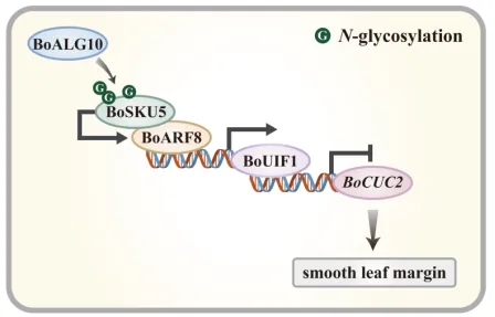 本研究揭示了N-糖基化修饰通过影响BoSKU5的核定位及其维持叶缘全缘的功能,进而参与调控羽衣甘蓝叶缘发育的作用机制,深化了N-糖基化修饰对于植物生长发育调控的认识。系统阐明了BoSKU5通过与生长素响应因子BoARF8形成复合物促进BoUIF1-BoCUC2转录级联的新途径,为羽衣甘蓝叶形分子育种提供精准靶点。在实践层面,该工作为培育具有优良叶形的羽衣甘蓝新品种提供了新策略,同时对其他园林植物的遗传改良具有重要参考价值。图7 BoSKU5调节羽衣甘蓝叶缘发育的模型图