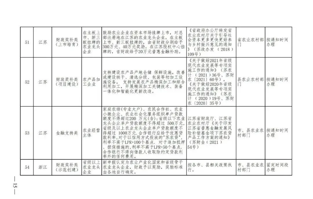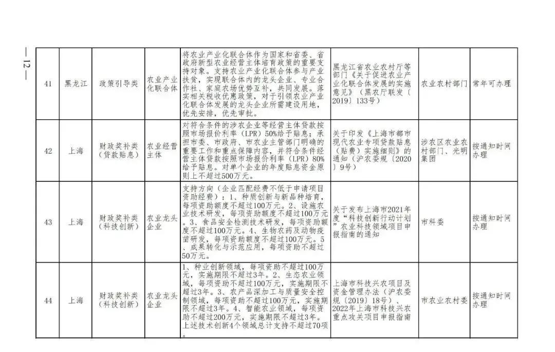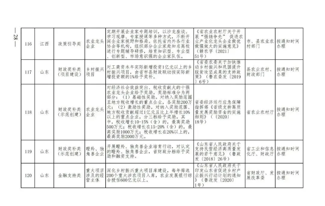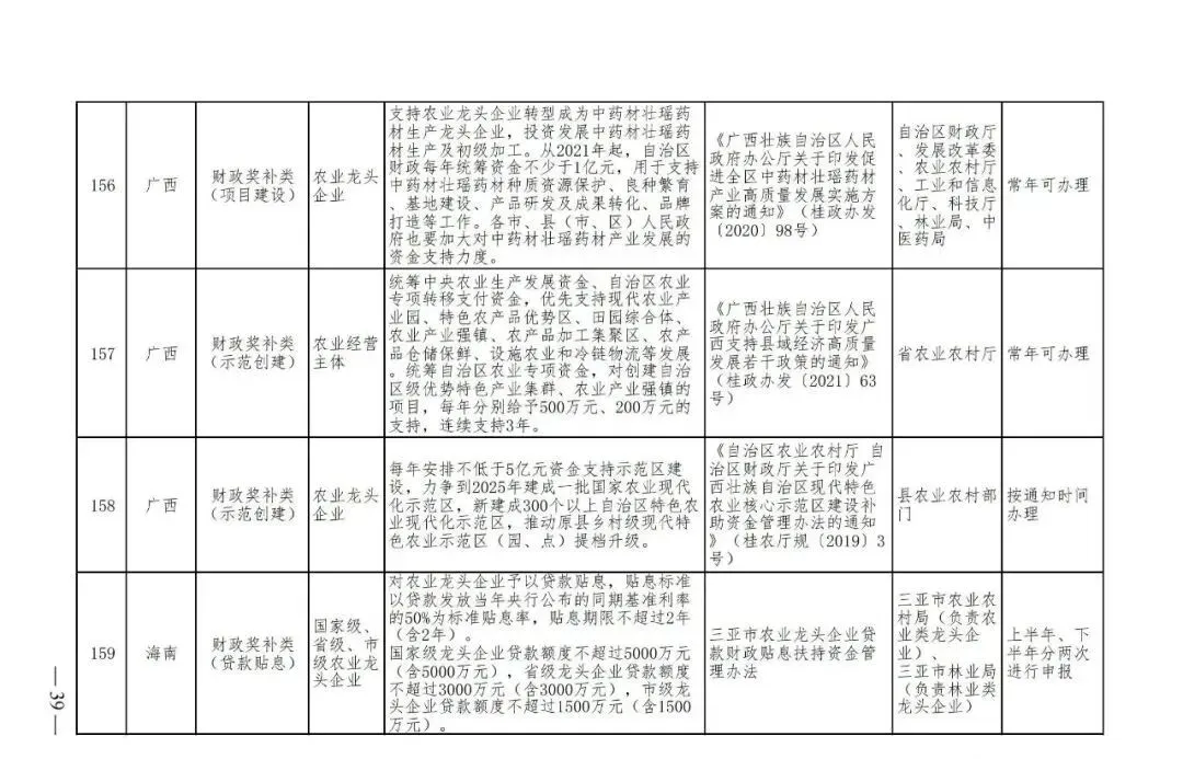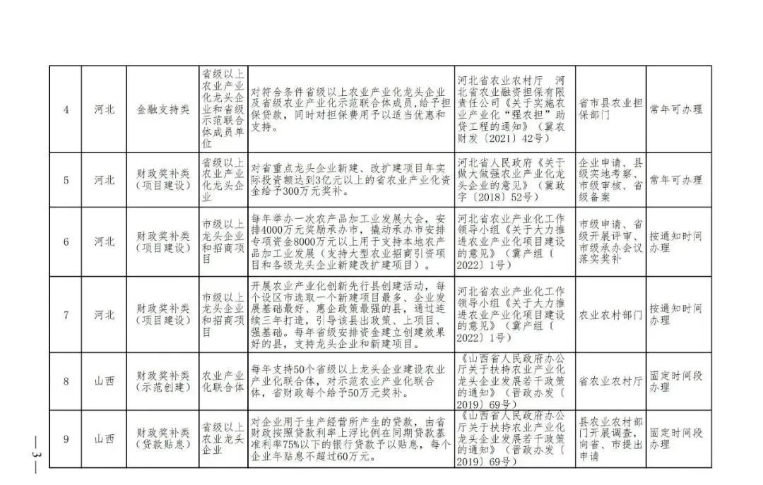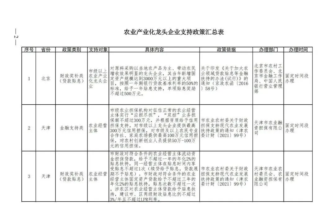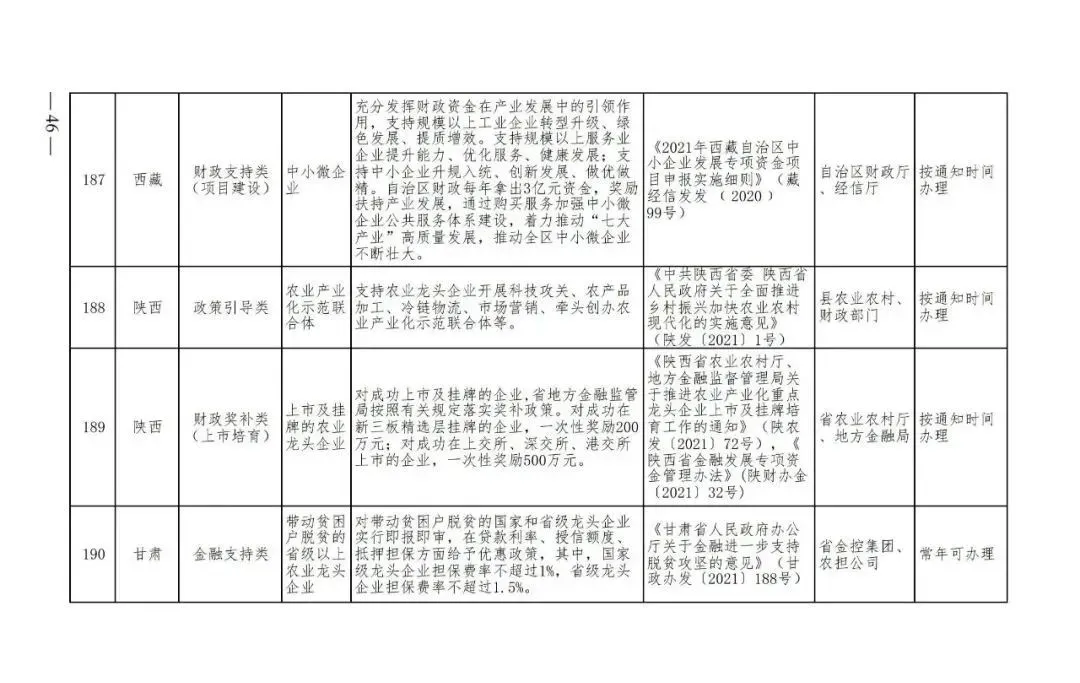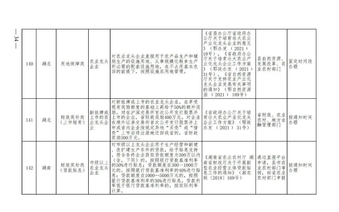为加强对农业产业化龙头企业的精准服务,农业农村部乡村产业发展司收集了各省(区、市)对龙头企业的支持政策,于近期印发《农业产业化龙头企业支持政策清单》(简称《清单》),供各地互相参考学习。