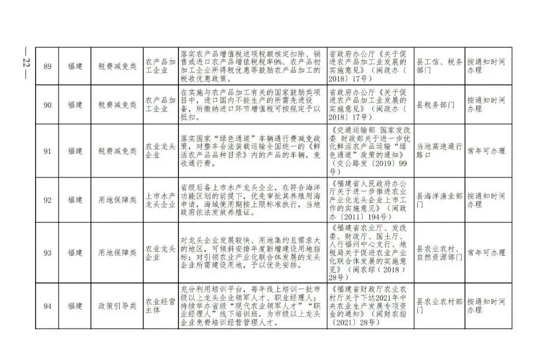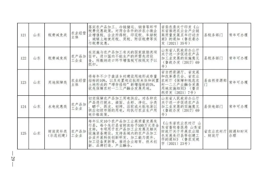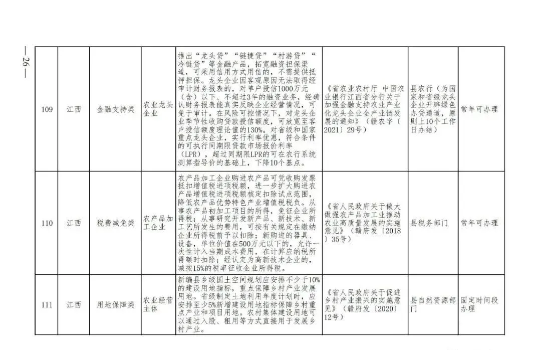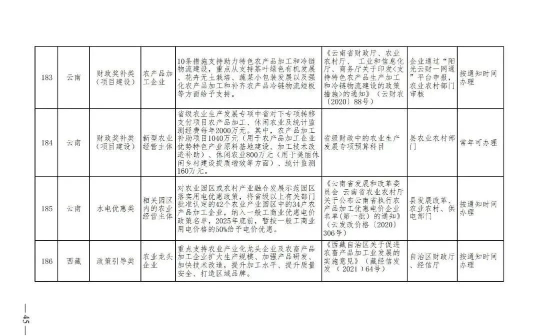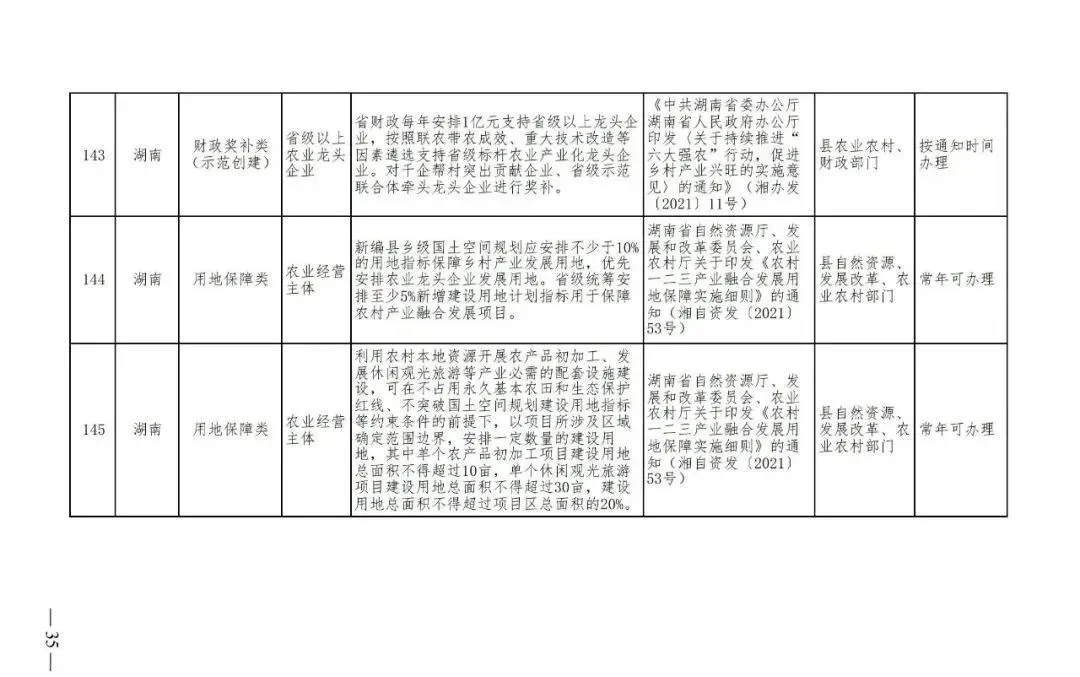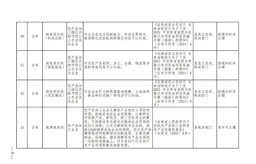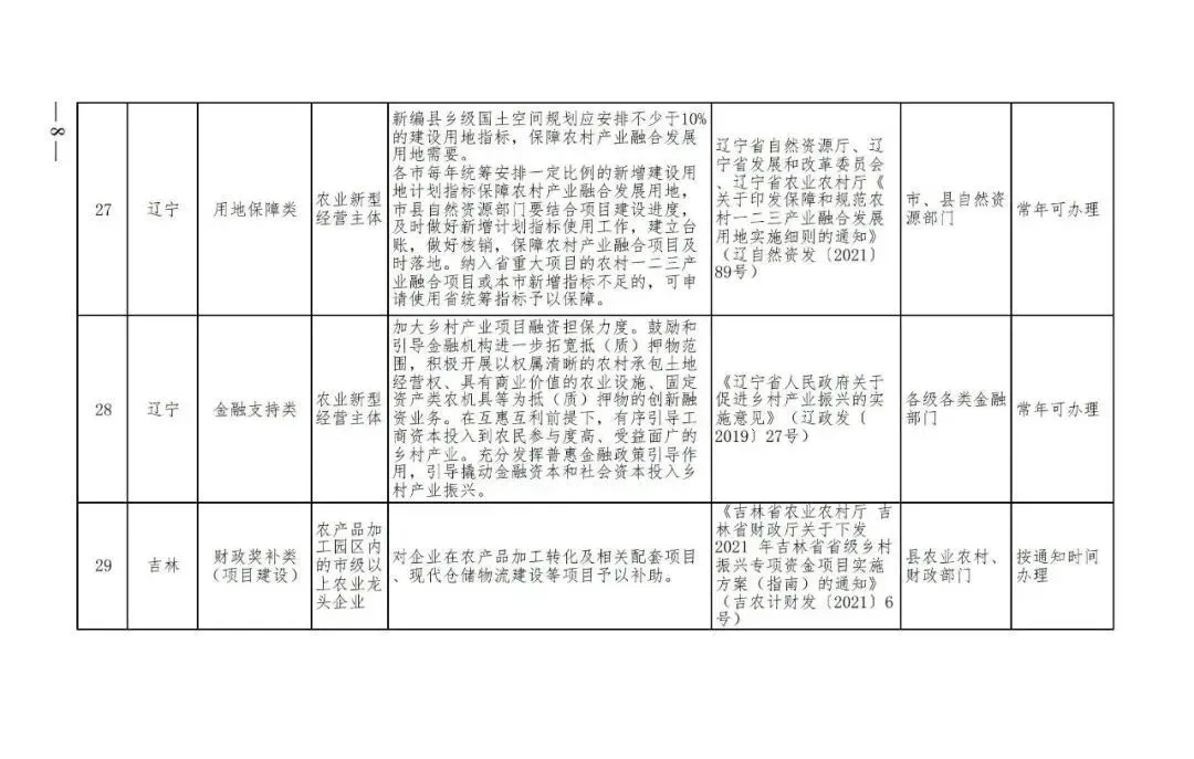 《清单》按照“政策类别、支持对象、具体内容、政策依据、办理部门、办理时间”进行梳理,共涉及“财政奖补、金融支持、用地保障、税费减免、水电优惠、政策引导”等六大类229条政策。《清单》通知,各地支持政策发生变化,要及时反馈,乡村产业发展司将定期更新发布。