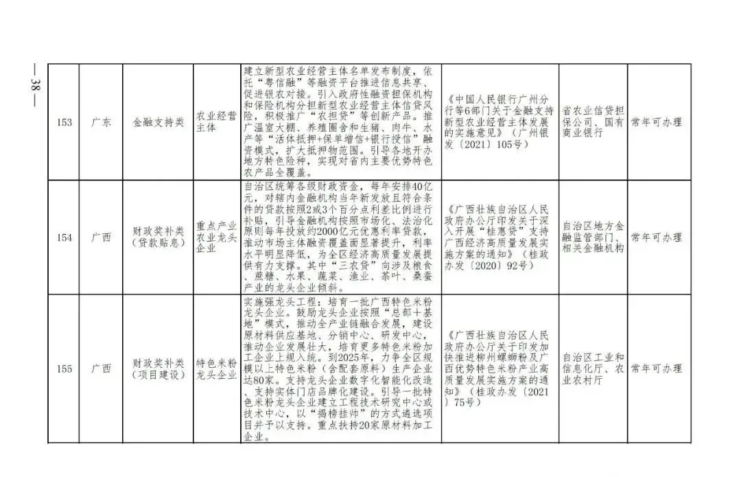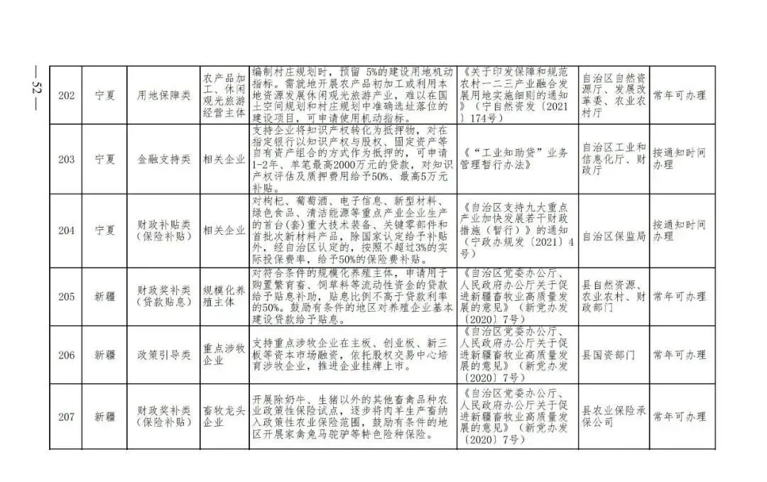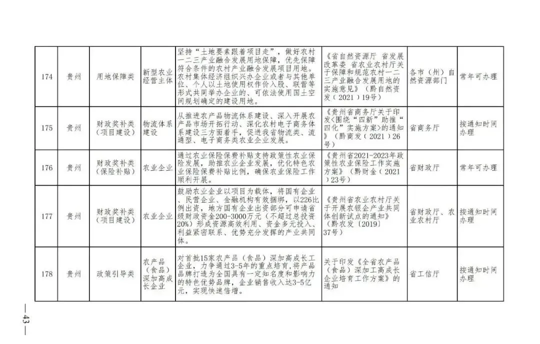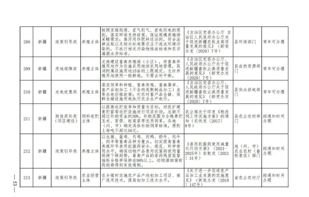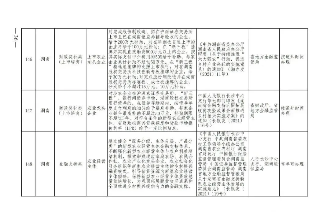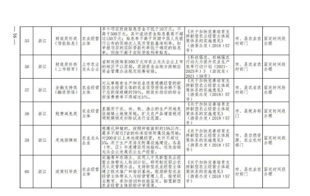 《清单》按照“政策类别、支持对象、具体内容、政策依据、办理部门、办理时间”进行梳理,共涉及“财政奖补、金融支持、用地保障、税费减免、水电优惠、政策引导”等六大类229条政策。《清单》通知,各地支持政策发生变化,要及时反馈,乡村产业发展司将定期更新发布。