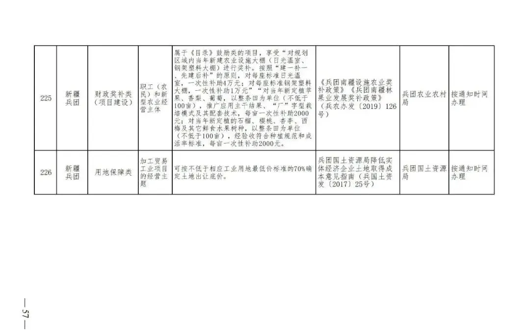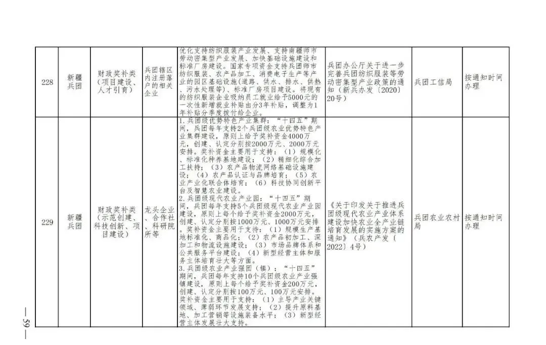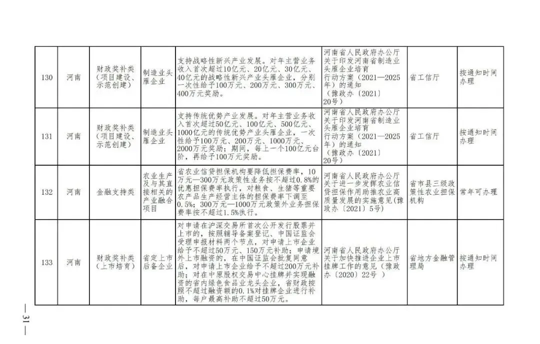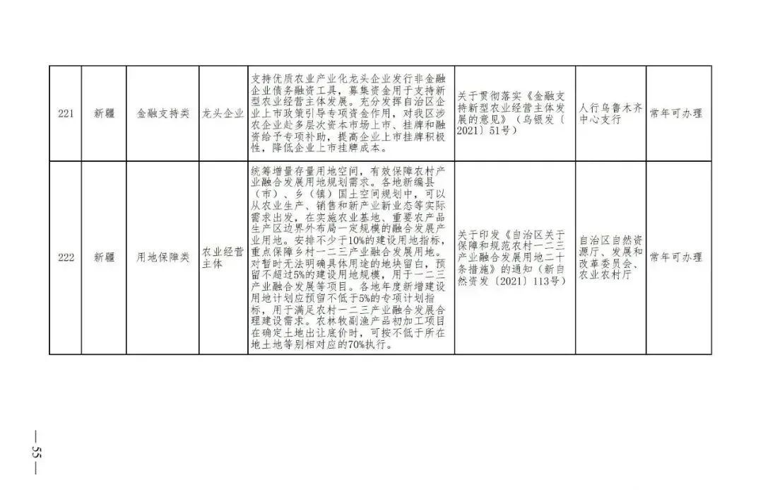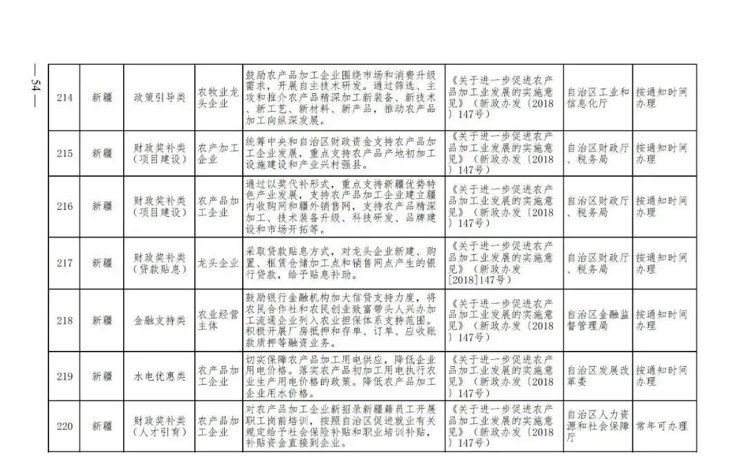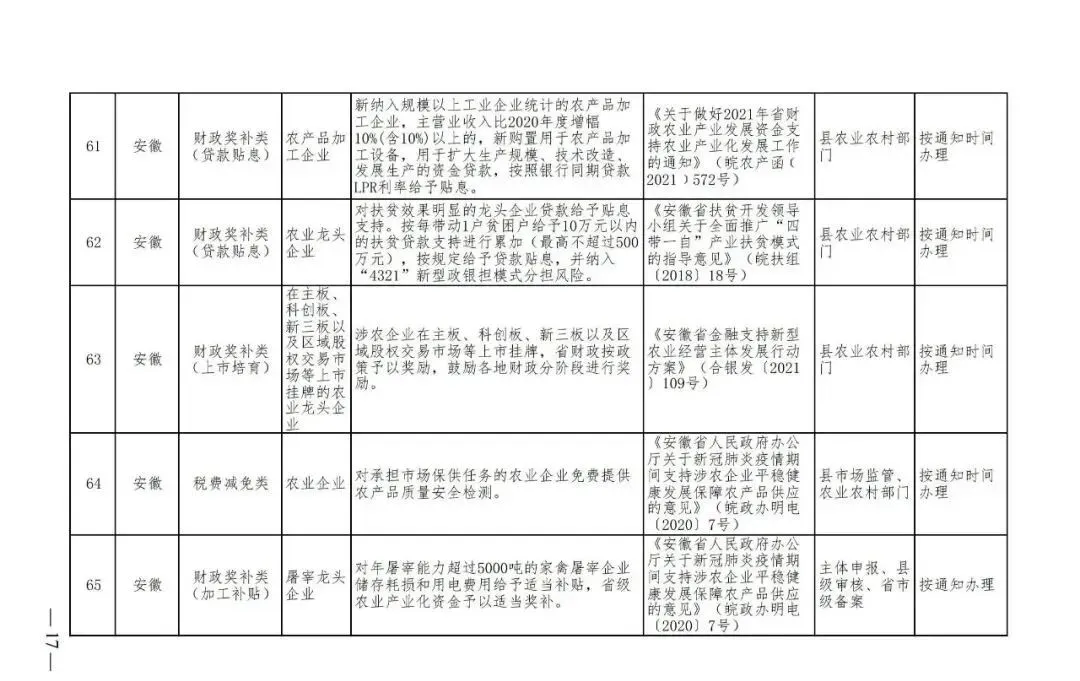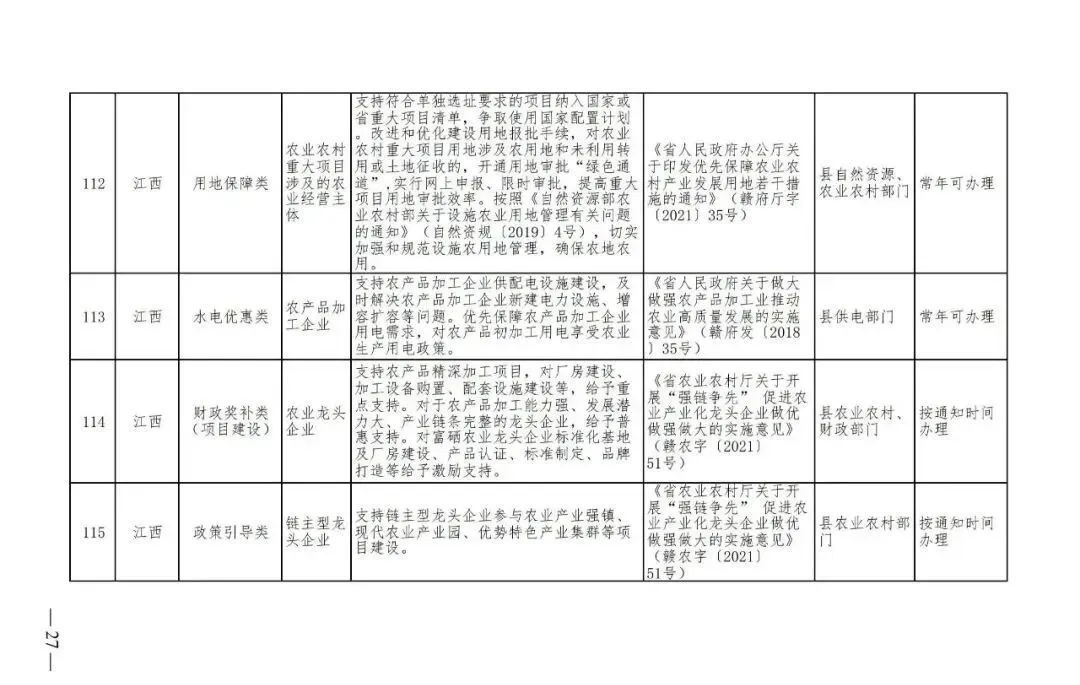 《清单》按照“政策类别、支持对象、具体内容、政策依据、办理部门、办理时间”进行梳理,共涉及“财政奖补、金融支持、用地保障、税费减免、水电优惠、政策引导”等六大类229条政策。《清单》通知,各地支持政策发生变化,要及时反馈,乡村产业发展司将定期更新发布。