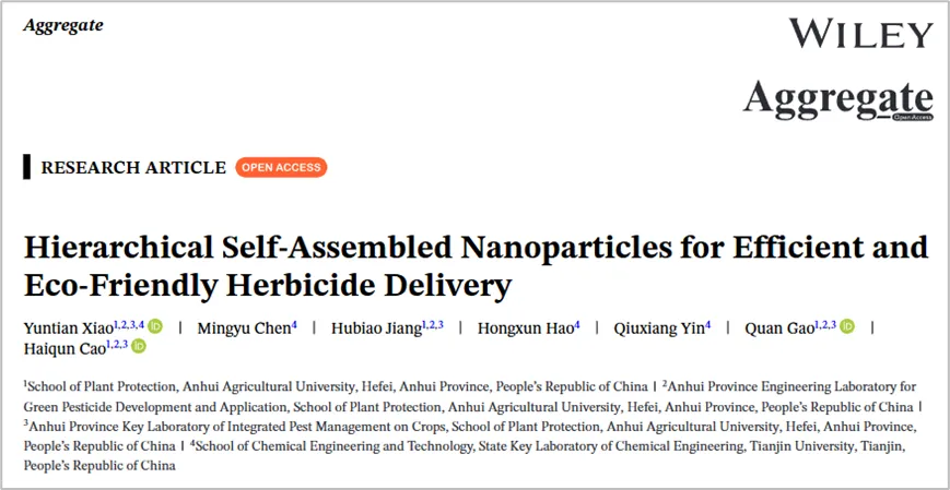 以上研究论文以“Hierarchical Self-Assembled Nanoparticles for Efficient and Eco-Friendly Herbicide Delivery”为题发表于Aggregate期刊,论文第一作者为安徽农业大学植物保护学院肖云天副教授,通讯作者为安徽农业大学操海群教授。