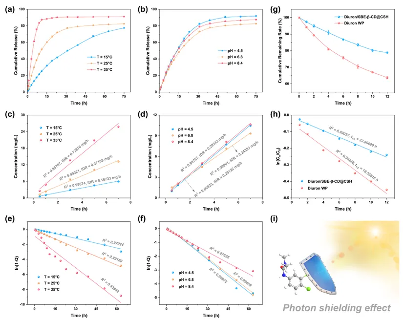 针对田间复杂环境条件,自组装纳米递送体系展现出显著的温度与pH响应特性。随着温度升高,敌草隆释放速率明显加快,35°C条件下72 h累计释放率超过90%,表现出典型的温度触发行为;在不同pH条件下,酸性环境中释放更为充分,体现出对土壤酸碱变化的适应能力。动力学分析表明,该体系符合一级释放模型,并呈现非Fick扩散特征。同时,在模拟紫外照射条件下,自组装纳米递送体系的光稳定性显著优于市售制剂,半衰期明显延长,表现出更强的抗光降解能力。这种多重环境响应与保护机制有助于提升田间利用效率并降低环境风险。