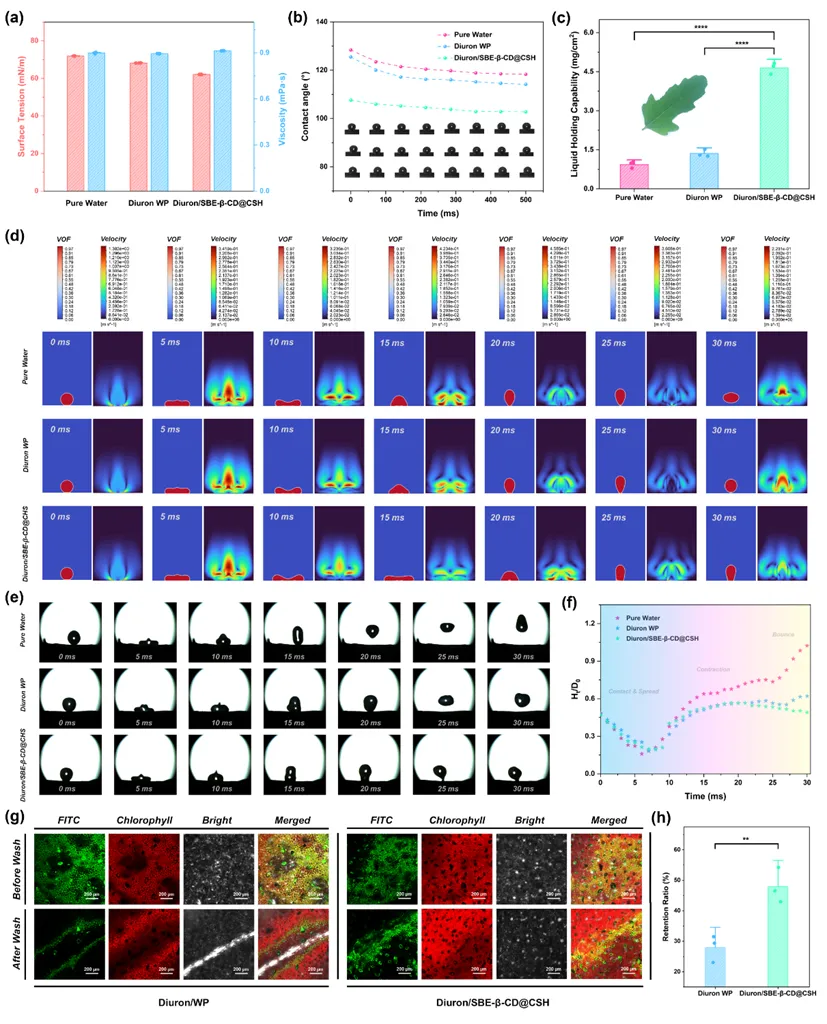 自组装纳米递送体系显著提升了叶面润湿性与抗雨水冲刷能力。相比清市售可湿性粉剂,其表现出更强的铺展与附着能力。计算流体力学模拟和实验证实,自组装纳米递送体系液滴在叶面冲击后回弹高度最低,能有效减少反弹与流失。扫描电镜与共聚焦结果显示,其在叶片表面形成均匀致密的纳米层结构,雨水冲刷后仍能稳定滞留,有助于提高田间利用效率并减少损失。