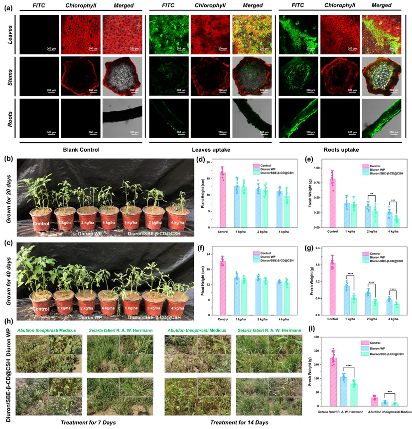 自组装纳米递送体系显著增强了敌草隆在杂草体内的吸收与系统传导能力。共聚焦成像显示,无论根施还是叶喷,纳米颗粒均可高效进入植株体内,并通过木质部和韧皮部实现上下运输,在叶肉细胞中明显富集。温室试验表明,在相同剂量下,自组装纳米递送体系对反枝苋等杂草的株高和鲜重抑制效果均优于市售可湿性粉剂,低剂量条件下优势更加显著。田间试验进一步验证了其优越性,对苘麻、马唐等杂草的防效明显提高,显示出良好的应用潜力。