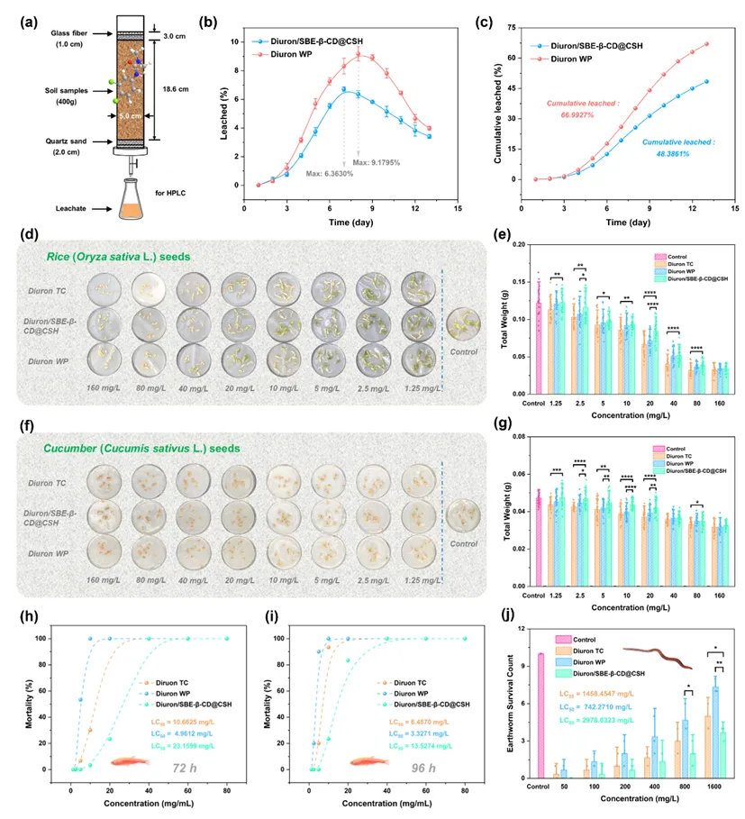 环境行为与生态安全评估显示,自组装纳米递送体系显著降低了敌草隆的迁移风险与生物毒性。土柱淋洗实验表明,其土壤保留率明显提高,累积淋失量降低,体现出更强的环境稳定性。在非靶标生物评价中,自组装纳米递送体系对作物种子萌发抑制作用更小,对斑马鱼的急性毒性显著降低,对心肌与肝细胞的细胞毒性和ROS水平明显减弱。大鼠长期暴露实验进一步证实,其肝脏、心脏等组织损伤显著缓解,氧化应激水平下降。整体结果表明,该超分子纳米体系在保障除草效果的同时,有效提升了环境相容性与生物安全性。