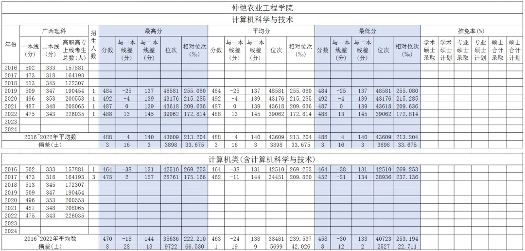 该校在广西考区2016~2022年的计算机科学与技术(或计算机类)本科专业的录取分数如图所示。2016~2022年招生专业为:2019~2022年计算机科学与技术,2016~2017年计算机类(含计算机科学与技术),均为二本招生。相对位次=位次/理科高职高专上线考生总人数,历年录取分数、位次、相对位次的平均数及偏差(历年分数、位次、相对位次与平均数的离散程度)如下: