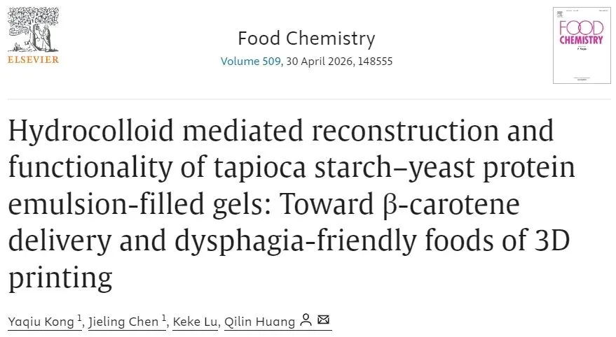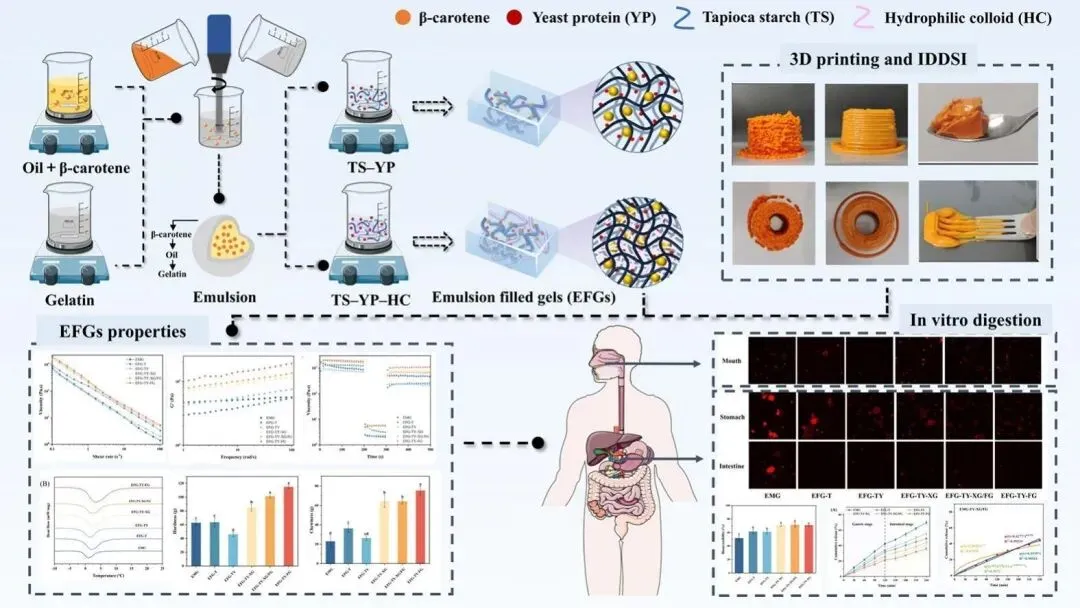亲水胶体介导的木薯淀粉-酵母蛋白乳液填充凝胶的重构与功能:面向β-胡萝卜素递送和适用于3D打印的吞咽障碍友好型食品