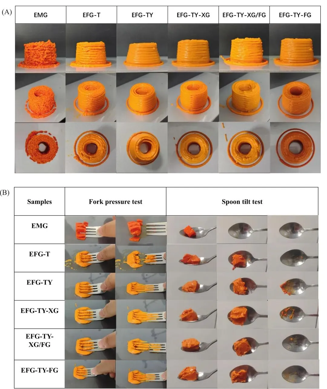 1. 三元协同打印:木薯淀粉-酵母蛋白-亲水胶体三元复合体系形成了更致密的凝胶网络,提升了3D打印的成型精度和结构支撑性。