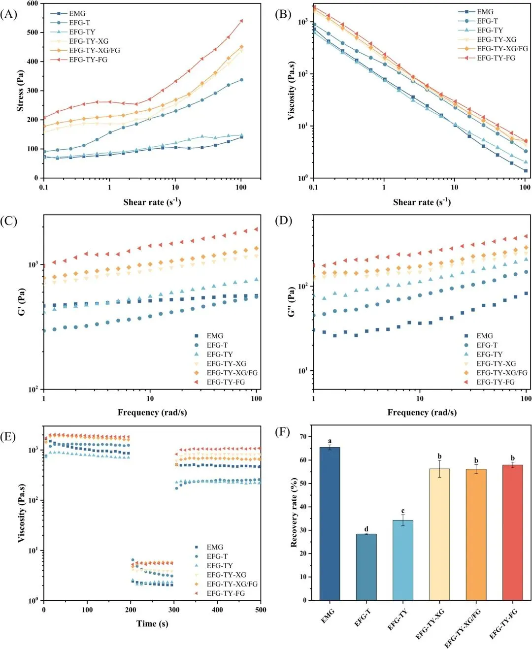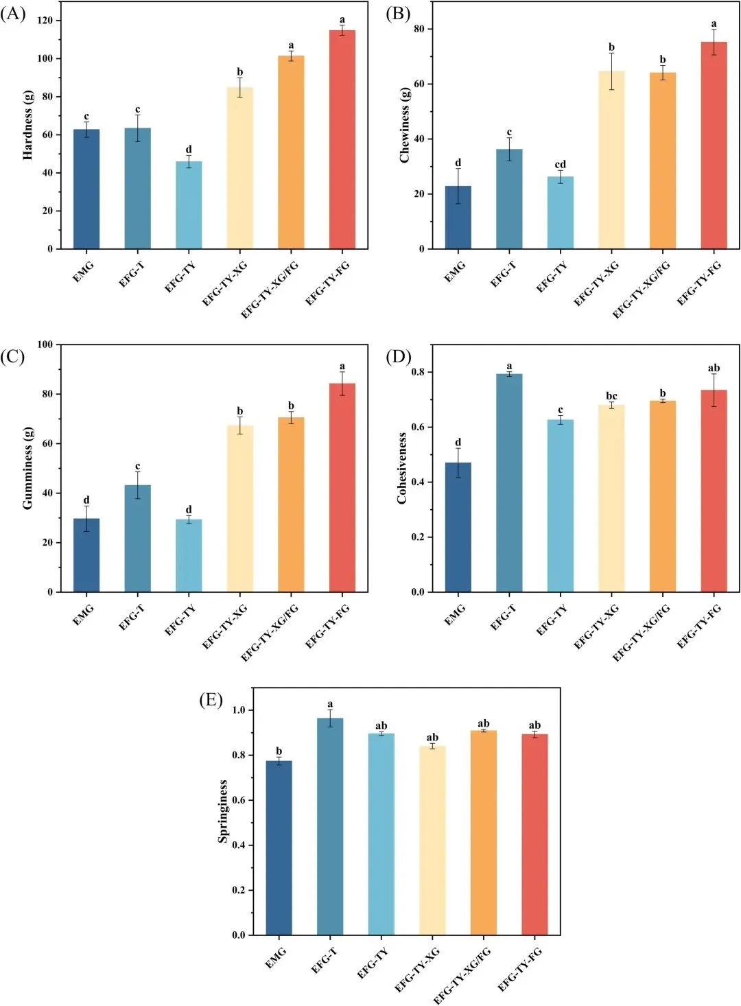 2. 质构增强,安全可吞:亲水胶体的加入提高了凝胶的粘弹性和凝胶强度,所有样品均符合国际吞咽障碍饮食标准化倡议5级标准,确保了食用安全性。