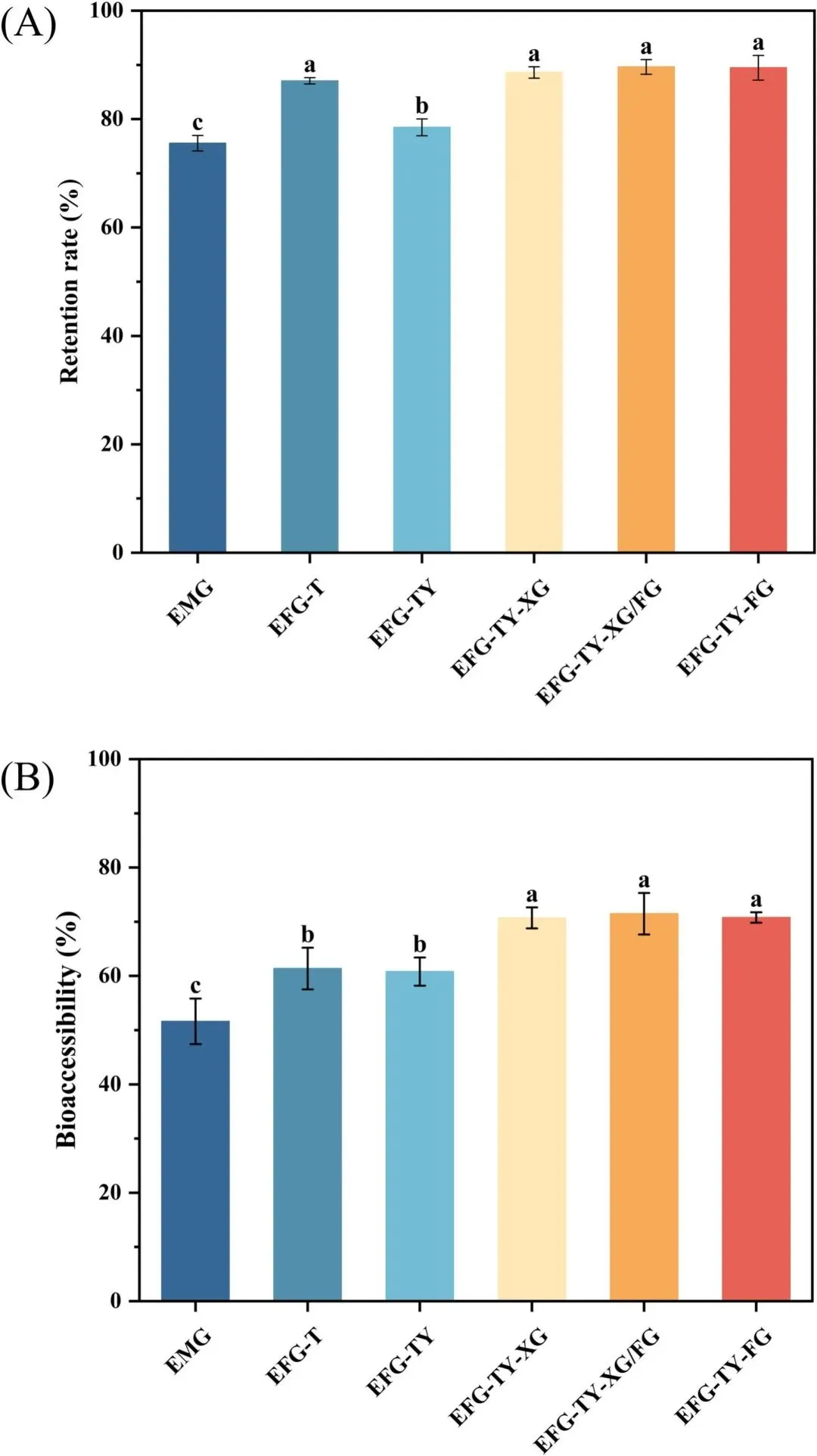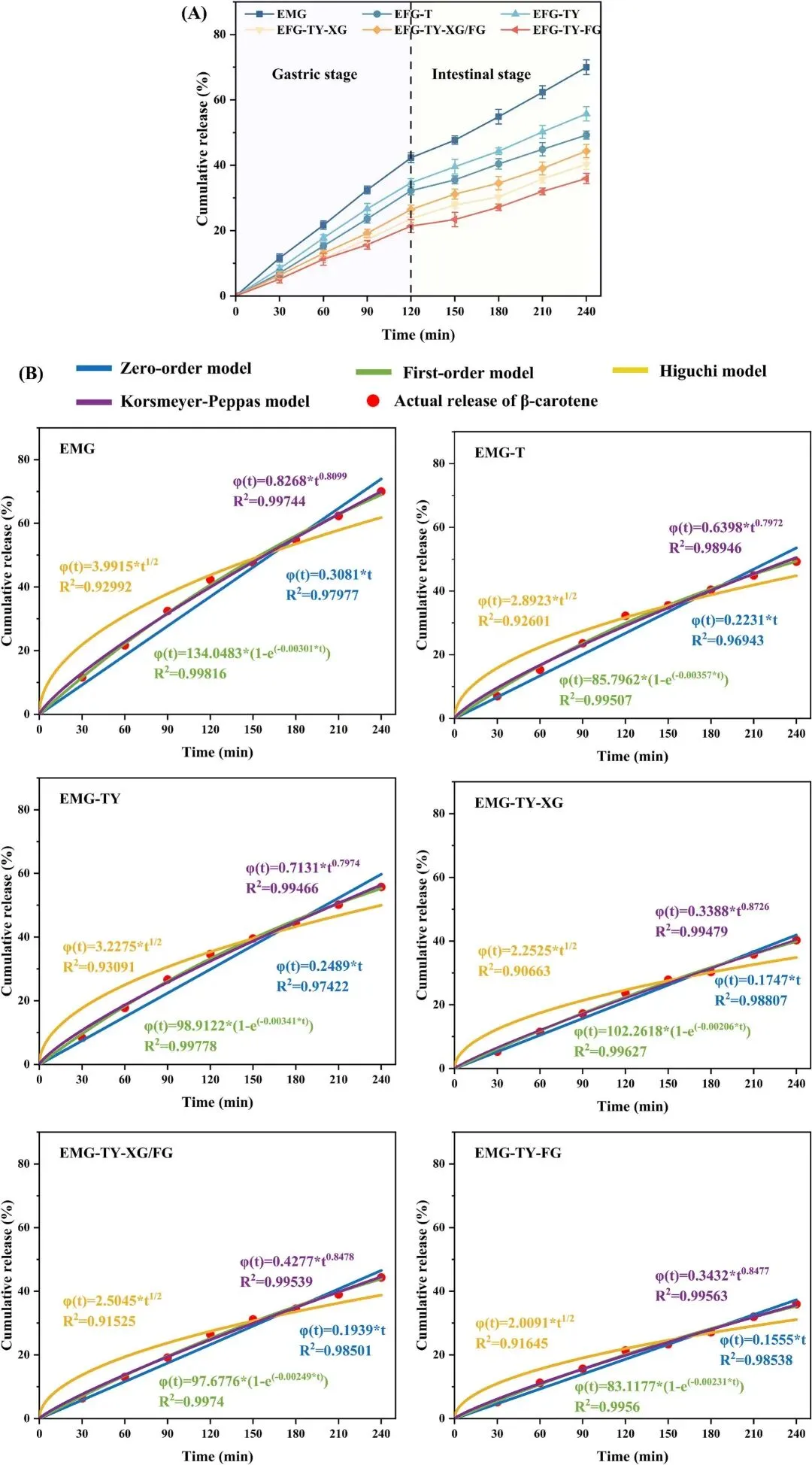 3. 缓释靶向递送:三元凝胶网络对β-胡萝卜素展现出优异的保护作用,其释放机制遵循非Fickian扩散,有效提高了其在消化过程中的稳定性(热保留率高达89.62%)和生物可及性(71.48%)。