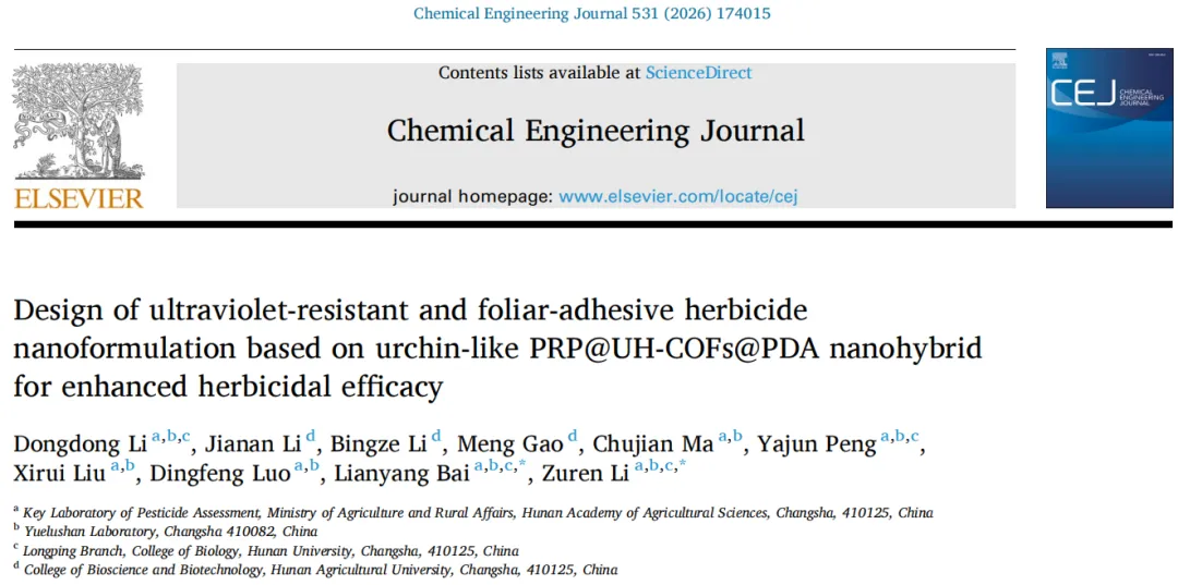近日,湖南省农业科学院李祖任老师与柏连阳老师团队合作在《Chemical Engineering Journal 》发表名为"Design of ultraviolet-resistant and foliar-adhesive herbicide nanoformulation based on urchin-like PRP@UH-COFs@PDA nanohybrid for enhanced herbicidal efficacy" 的期刊论文。该团队聚焦农业除草剂应用中的核心痛点,设计了一种类海胆状 PRP@UH-COFs@PDA 纳米杂化材料为载体的除草剂纳米配方,通过解决传统除草剂叶面粘附性差、紫外光解快的问题,大幅提升了除草效能,同时兼顾生物安全性和环境友好性,为新一代农药制剂研发提供了全新策略。