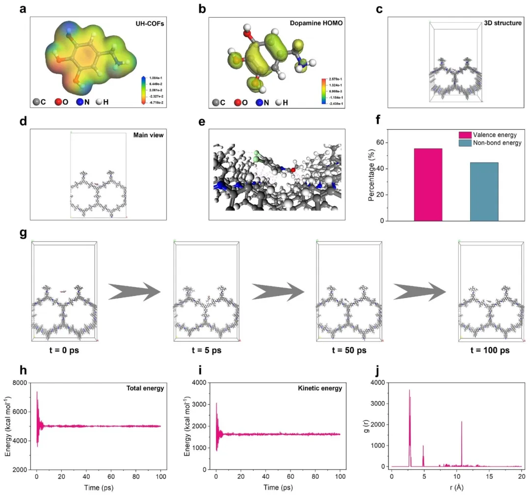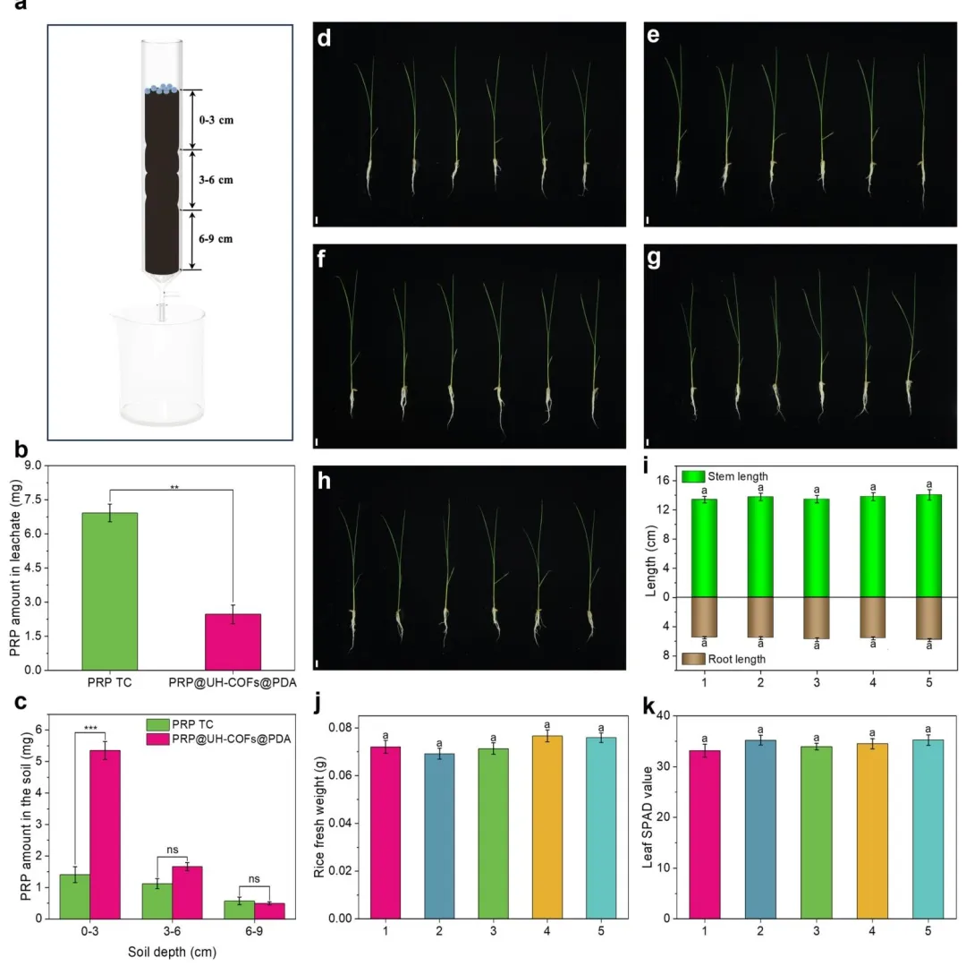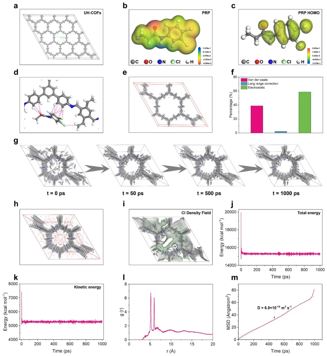 水稻是全球约 50% 人口的主食,主要在高温高湿的淹水区域种植。值得注意的是,这一重要作物在整个生长周期中均会遭受杂草的持续侵害,该问题已对全球粮食安全构成威胁。稗草作为稻田中危害最严重的杂草,会大量掠夺氮素,导致水稻减产 50%~80%。丙草胺是一种酰胺类除草剂,通过抑制光合作用发挥除草作用,被广泛用于稗草的防除。目前,市售丙草胺制剂包括可湿性粉剂、水分散粒剂和乳油等,其粒径多处于微米级别,与叶片表面的接触面积有限,易从叶片滑落,造成有效成分大量流失,降低田间应用效率。此外,稗草叶片表面分布着大量不规则凸起、气孔和褶皱,形成的微纳结构让叶片表面粗糙且疏水,极大阻碍了农药的沉积附着。同时,丙草胺易受紫外线照射发生降解,在农业应用中半衰期短、稳定性差。在此背景下,研发兼具叶面粘附性与抗紫外性的丙草胺制剂,对于显著提升其有效成分的利用效率至关重要。聚多巴胺是一种仿贻贝天然高分子材料,因其良好的亲水性、生物相容性、成本低廉且易于合成的特点,受到研究者的广泛关注。值得一提的是,聚多巴胺涂层可吸收紫外线,从而阻止有效成分发生紫外光解。聚多巴胺优异的成膜性使其能均匀包覆在各类载体表面,实现对农药的有效包封,防止其过早泄漏。聚多巴胺的分子结构中含有大量邻苯二酚基团,可与叶片蜡质层中的脂肪酸、醇类和醛类形成氢键,因此,聚多巴胺涂层既能显著提升农药有效成分的光稳定性,又能增强纳米载体在叶片表面的粘附性。该研究提出一种简单、可控且通用的室温合成方法,制备类海胆状空心共价有机框架。该温和的合成方法能实现对反应过程的精准调控,且易于规模化生产,在效率和实用性上均优于传统的溶剂热法。以所制备的类海胆状空心共价有机框架为基础,通过负载丙草胺并进行聚多巴胺涂层修饰,制备得到PRP@UH-COFs@PDA,将其用于构建兼具叶面粘附性与抗紫外性的除草剂纳米制剂,以实现对杂草的高效防除。2.1 PRP@UH-COFs@PDA 的合成与系列表征图1为 PRP@UH-COFs@PDA 的合成与系列表征结果,其中 a 展示了该纳米杂化材料的分步合成流程,先通过室温席夫碱反应制备 UH-COFs,再负载 PRP 得到 PRP@UH-COFs,最后经多巴胺自聚完成 PDA 涂层修饰获得目标产物;b 和 c 的 TEM 图像分别呈现了 UH-COFs 的类海胆状空心原始形貌,以及 PDA 涂层后仍保留该形貌且棘间空间被部分填充的 PRP@UH-COFs@PDA 形貌;d-g 的 EDXmapping 图像证实 N、O、Cl 元素在 PRP@UH-COFs@PDA 中均匀分布,且 Cl 元素的分布与纳米颗粒轮廓一致,直接证明 PRP 成功负载;h 的 PXRD 图谱显示 PRP 负载和 PDA 涂层后 UH-COFs 的特征峰减弱,印证了 PRP 的孔道填充和 PDA 的表面包覆;i 和 j 的 FT-IR 及放大谱图不仅检测到 PRP 的特征吸收峰,还在 PRP@UH-COFs@PDA 中发现 PDA 的 N-H 特征峰(1507 cm⁻¹),证实 PRP 负载与 PDA 修饰的成功;k 的 zeta 电位结果显示 UH-COFs 经 PRP 负载、PDA 涂层后电位从 + 40.5 mV 依次降至 + 20.6 mV、+2.6 mV,反映了各步修饰的静电相互作用;l 的 XPS 全谱在 PRP@UH-COFs 和 PRP@UH-COFs@PDA 中出现 PRP 特征的 Cl 2p 峰,且 UH-COFs@PDA 的 C/N 原子比降低,进一步佐证 PRP 负载和 PDA 涂层;m 的 TGA 和 DTG 曲线则在 PRP@UH-COFs@PDA 中检测到 UH-COFs、PRP、PDA 各自的热分解过程,最终证实该纳米杂化材料的成功制备。图1:PRP@UH-COFs@PDA 的合成与系列表征2.2 UH-COFs 对PRP的吸附机制及分子动力学(MD)模拟图2为 UH-COFs 对 PRP 的吸附机制及分子动力学(MD)模拟结果,其中 a 展示了具有 3D 堆叠结构的 2D UH-COFs 晶体周期性结构,为 PRP 吸附提供有序孔道;b 的 PRP 分子静电势图呈现出羰基相关的负电区和碳骨架的正电区,c 的 PRP 最高占据分子轨道(HOMO)图显示电子云主要定域在羰基和碳链部分,二者明确了 PRP 参与吸附的活性位点;d-e 为 PDA 与 UH-COFs 主体间关键相互作用示意图及 UH-COFs 孔内吸附位点细节图,直观呈现二者结合方式;f 的能量分解分析表明静电相互作用是 PRP 与 UH-COFs 结合的主要驱动力,非键相互作用为补充,吸附能达 1.12 eV;g 的 1000 ps MD 模拟捕捉到 PRP 分子从初始随机分布逐步形成稳定吸附构型的动态过程;h-i 为 PRP 分子在 UH-COFs 孔道网络的吸附位点分布及氯原子密度场图,证实 PRP 在孔道内的特异性、稳定吸附;j-m 的 MD 过程中总能量变化、动能转变、径向分布函数(RDF)及均方位移(MSD)分析,进一步验证了吸附过程的热力学自发性与稳定性,RDF 揭示 PRP 羰基氧与 UH-COFs 活性位点的短程强相互作用,MSD 得出的扩散系数(6.9×10⁻¹⁴ m²/s)表明 UH-COFs 对 PRP 存在强吸附作用,整体阐明了 UH-COFs 对 PRP 的吸附主要由静电引力、氢键及结构相容性共同调控。图2:UH-COFs 对PRP的吸附机制及分子动力学(MD)模拟2.3 多巴胺在 UH-COFs 上的吸附机制及分子动力学(MD)模拟图3为多巴胺在 UH-COFs 上的吸附机制及分子动力学(MD)模拟结果,其中 a 的多巴胺分子静电势图呈现出明显的正负电荷分区,b 的多巴胺最高占据分子轨道(HOMO)图显示电子云主要定域在羰基基团处,二者明确了多巴胺与 UH-COFs 结合的活性位点;c-d 分别展示了多巴胺吸附在 UH-COFs (100) 晶面的 3D 结构和主视图,直观体现出二者的空间结构相容性;e 为多巴胺与 UH-COFs 主体间关键相互作用示意图,清晰呈现二者的结合方式,f 的能量分解分析表明价电子相互作用和非键相互作用共同为多巴胺与 UH-COFs 的吸附提供驱动力,吸附能达 0.96 eV;g 的 100 ps MD 模拟捕
