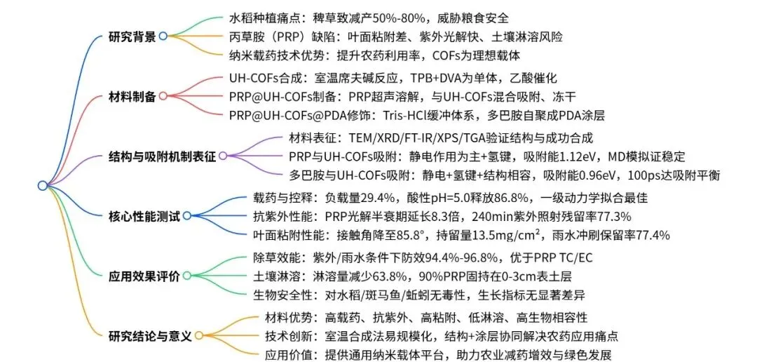 关键词:除草剂纳米制剂;叶面粘附性;抗紫外性能;共价有机框架;类海胆状纳米杂化材料;生物安全性