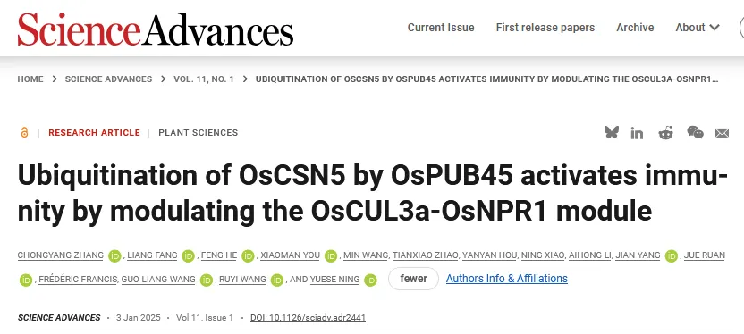 2025年1月3日,中国农业科学院植物保护研究所作物病原生物功能基因组研究创新团队在Science子刊《科学进展》(Science Advances)上发表了题为“Ubiquitination of OsCSN5 by OsPUB45 activates immunity by modulating the OsCUL3a-OsNPR1 module”的研究论文。该研究报道了E3泛素连接酶OsPUB45通过泛素化降解OsCSN5调控OsCUL3a-OsNPR1模块,调控水稻广谱抗病的新机制。