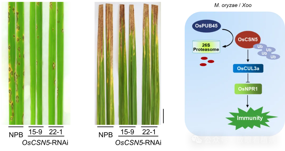 该研究发现,在水稻中抑制表达OsCSN5增强了对稻瘟病和白叶枯病的抗病性且不影响水稻正常生长。利用团队创制的水稻E3泛素连接酶文库(UbE3)筛选到OsCSN5的E3泛素连接酶OsPUB45,OsPUB45泛素化并通过26S蛋白酶体系统促进OsCSN5降解。进一步发现OsCSN5通过稳定OsCUL3a,进而促进抗病正调控因子OsNPR1的降解负调控抗病性。在水稻中过量表达OsPUB45,则会抑制OsCUL3a蛋白积累,进而促进OsNPR1蛋白稳定性,反之敲除OsPUB45则会抑制OsNPR1蛋白积累。该研究证明COP9信号复合体亚基OsCSN5是水稻广谱抗病的关键感病因子,在植物中首次发现调控CSN5蛋白稳态的E3泛素连接酶,并深入解析了CSN5蛋白的稳态调控和广谱抗病机制,为培育广谱抗病新品种提供了重要理论基础和候选基因。