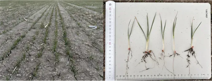 地块一小麦品种为‘农大179’,2025年11月1日采用15cm等行距播种,播量20 kg/亩。播后镇压,冬前浇灌冻水。目前小麦个体2叶1心,总茎数28.4万/亩,为三类苗。