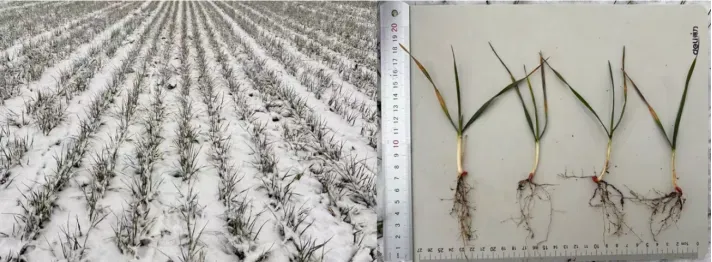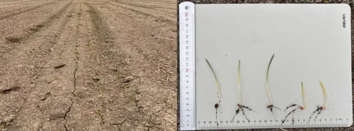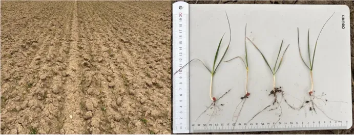 地块二于2025年11月8日采用15cm等行距播种,播量30kg/亩,播后镇压,冬前浇灌冻水。小麦个体“一根针”,部分麦苗“土里捂”,总茎数22.1万/亩,为三类苗。两块地墒情较好,但因播种偏深、出苗率降低、个体细弱,整地质量一般,地表裂缝较多。