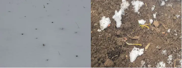 管理建议:当前积雪厚度达6cm,至雪融前不需进行任何措施。待麦苗出土且叶片展开后,喷施磷酸二氢钾叶面肥和氨基酸类生长调节剂促进生长,适时进行浅锄划。在返青期每亩追施尿素6-8公斤。拔节后进行第二次水肥管理,追施尿素12—14公斤,保穗数、争粒数。