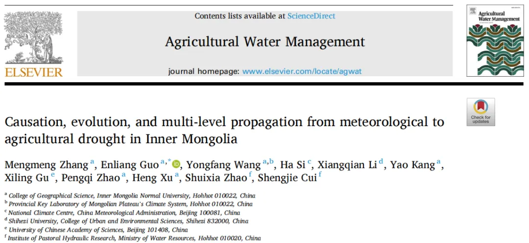 Zhang, M., Guo, E., Wang, Y., Si, H., Li, X., Kang, Y., Gu, X., Zhao, P., Xu, H., Zhao, S., & Cui, S. (2026). Causation, evolution, and multi-level propagation from meteorological to agricultural drought in Inner Mongolia. Agricultural Water Management, 110236. https://doi.org/10.1016/j.agwat.2026.110236