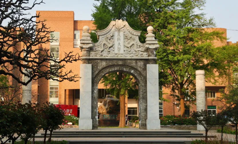 老校门位于西区校史馆之前,整体高8.5米,正门为拱劵形制,内空2.38米,在鲁班尺里正是最适宜用来办学的尺寸称为“进学”,正门之上的额坊雕刻着传统的飞龙和祥云,两侧立柱却采用希腊爱奥利亚形制,恰合京师大学堂“中学为体,西学为用”的主张。其材料选用的是民国时期北京常用的青白石和砖,色调古朴。