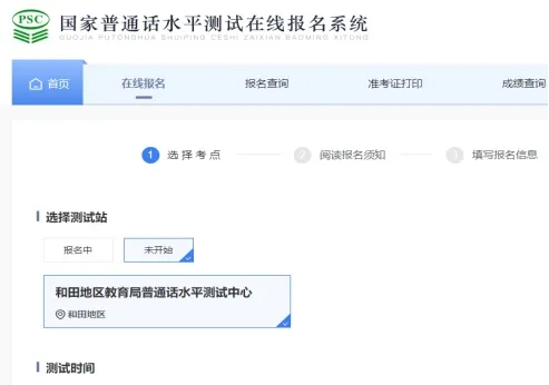 2.注册完成后打开在线报名页面---选择测试站---点击“和田地区教育局普通话水平测试中心”---点击“测试时间”---核实测试地址(和田市第十二小学测试点)---点击下一步,认真查看报名公告---进行网上报名。