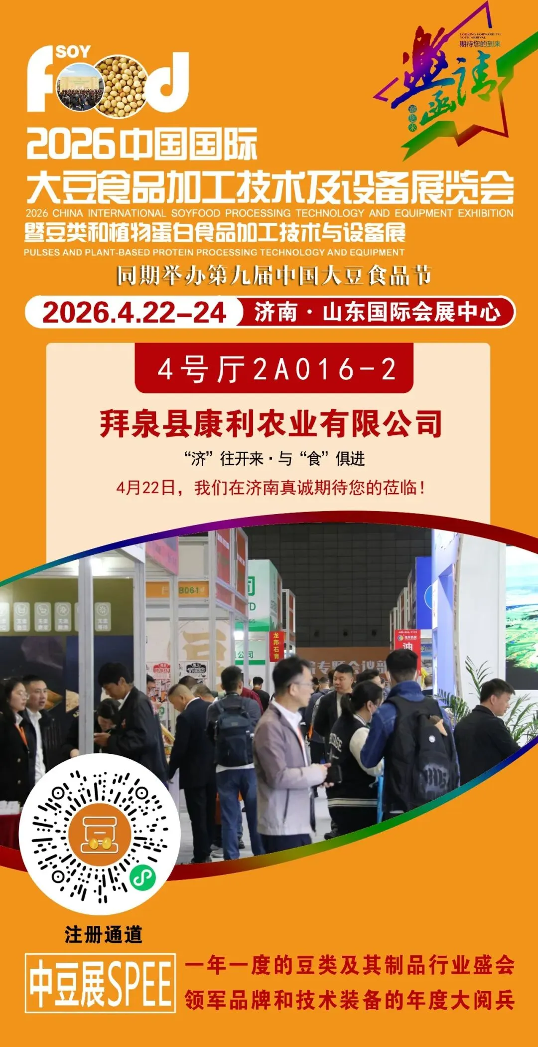 为进一步深化行业交流合作,共享市场变革新机遇,2026年中国国际大豆食品加工技术及设备展览会(中豆展SPEE2026)定于2026年4月22日-24日在济南·山东国际会展中心隆重召开。诚邀业界同仁共襄盛举,携手为保障国家粮食安全和全民健康贡献智慧与力量!