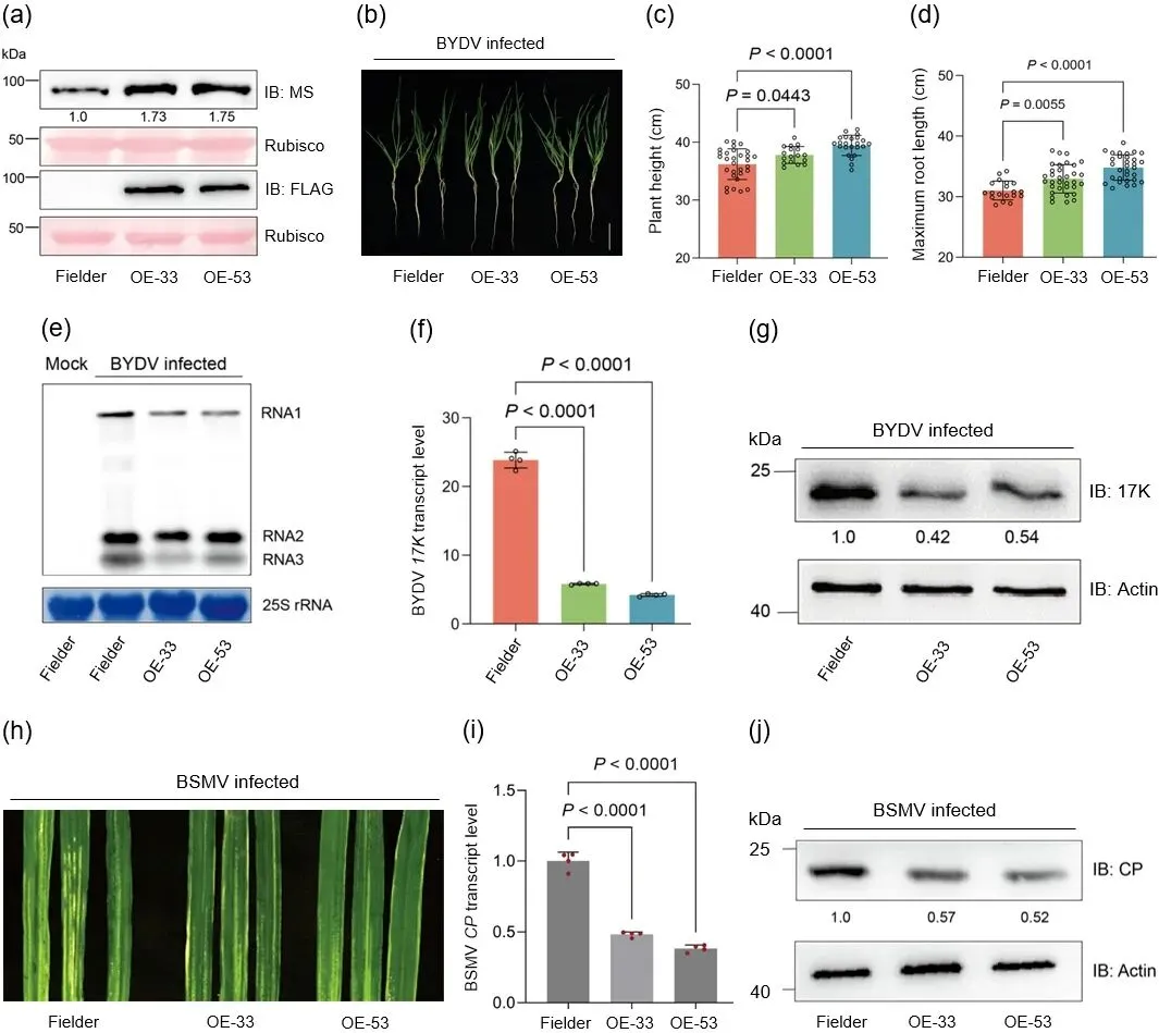 图:MS1过表达小麦对BYDV-GAV和BSMV的抗性分析