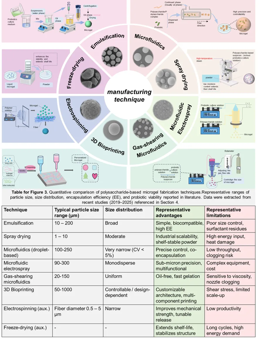 益生菌的健康效应建立在“活菌到达肠道”这一前提之上。但在食品加工与人体消化环境中,益生菌会面临多重挑战:食品加工过程中的加热、冷冻、干燥等处理;储存过程中的氧化与水分波动;胃内强酸环境及胆盐、消化酶作用。这些因素会导致益生菌存活率显著下降,使其难以达到发挥功效所需的有效菌量。论文聚焦“多糖微凝胶(microgels)”这一新型递送载体。微凝胶是粒径在0.1–100 μm范围内的水凝胶微粒,相比传统大块水凝胶,其具有更高比表面积、更可控的交联密度以及可逆溶胀特性,因此更适合实现益生菌的高效包埋与受控释放。研究系统梳理了多糖微凝胶递送体系的核心设计要素:(1)材料选择:从经典多糖到新型海洋多糖;(2)结构构建:复合壁材与多层网络提升性能;(3)制备技术:从规模化到高精度。论文总结认为,多糖微凝胶可通过调控粒径、交联密度与溶胀行为,提高益生菌对胃酸、胆盐等应激的耐受能力,并实现更具针对性的肠道释放。同时,复合网络与合理改性能够提升微凝胶完整性,解决“保护强但释放差”或“释放快但保护弱”的矛盾。在食品应用中,多糖微凝胶不仅有助于提升益生菌加工与储存稳定性,也能在部分体系中改善产品质构与品质,但其效果仍受配方与食品基质影响。