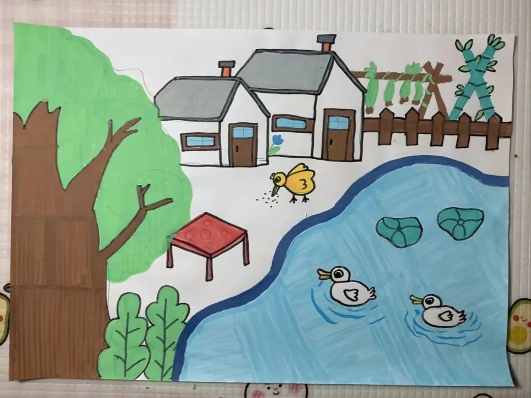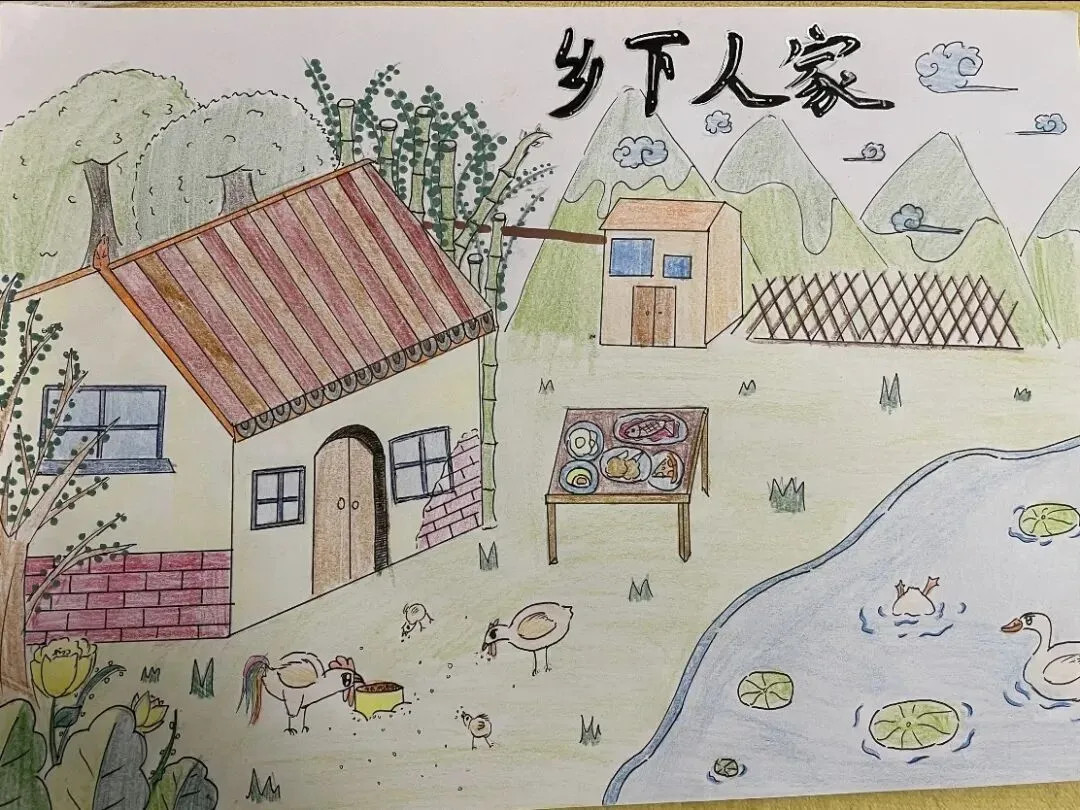 随后,乡土主题绘画与手工创作环节正式展开。服务队成员们鼓励孩子们自由发挥,用水彩、拼贴、立体模型等形式表达对家乡的印象。他们将走访速写、课堂作品与手账相结合,用文字和图画记录下对家乡的美好祝愿。