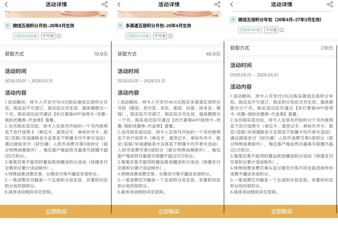 多渠道5倍积分月包(46.6元):这个更猛,覆盖微信、支付宝、京东、美团等七八个主流渠道,上限也高,每月最多送10万积分。如果你消费不局限于微信,这个包的“性价比”可能更高。