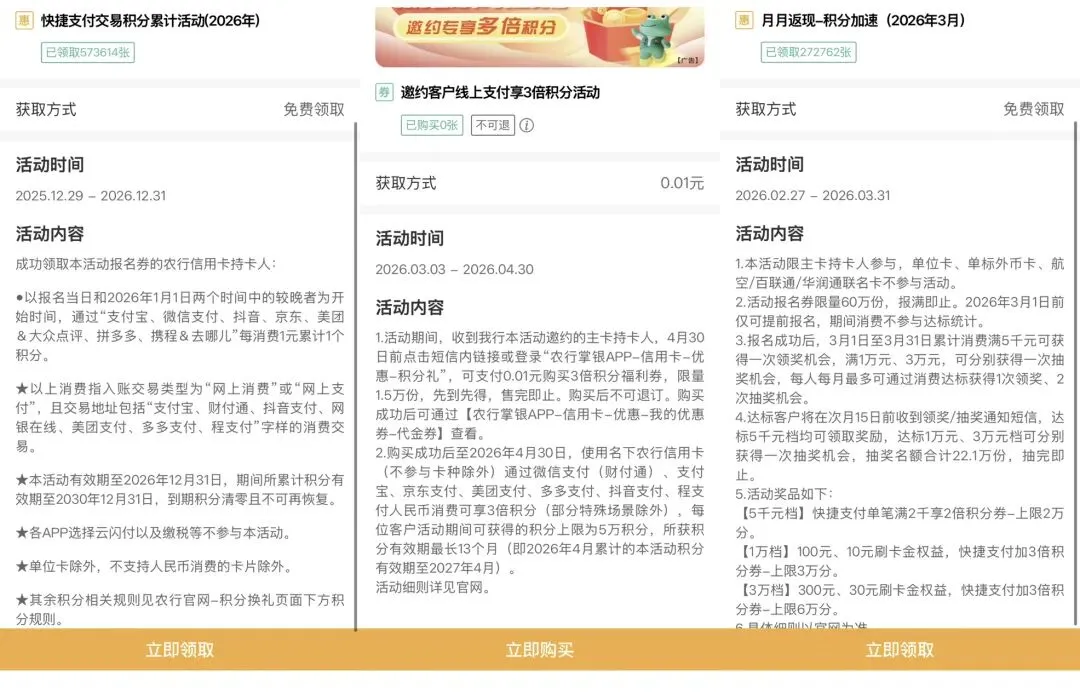 农行今年在积分上是真下本了,活动多得跟自助餐似的。咱别慌,先看清楚都有啥菜。