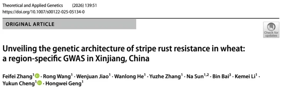上述研究成果由新疆农业大学农学院博士研究生张飞飞与已毕业硕士生王荣并列第一作者,程宇坤副教授和耿洪伟教授为通讯作者,在《Theoretical And Applied Genetics》期刊发表,题目为“Unveiling the genetic architecture of stripe rust resistance in wheat: a region specific GWAS in Xinjiang, China”的研究论文。该研究得到伊犁谷地主要作物病虫害绿色防控技术研发项目(2022B02015-3)、中国博士后科学基金 (2021MD703887)和新疆维吾尔自治区重大科技专项项目(2024A02003-2)项目资助。