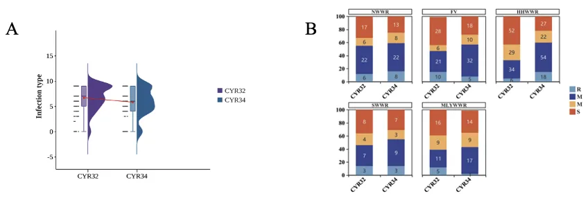 苗期抗性:300份材料对优势小种CYR32、CYR34的侵染型呈连续分布,41.7%抗CYR32、56.3%抗CYR34,27%对两个小种均抗;16份材料表现出全生育期抗性(ASR),整体苗期抗性水平较高(图1、2)。