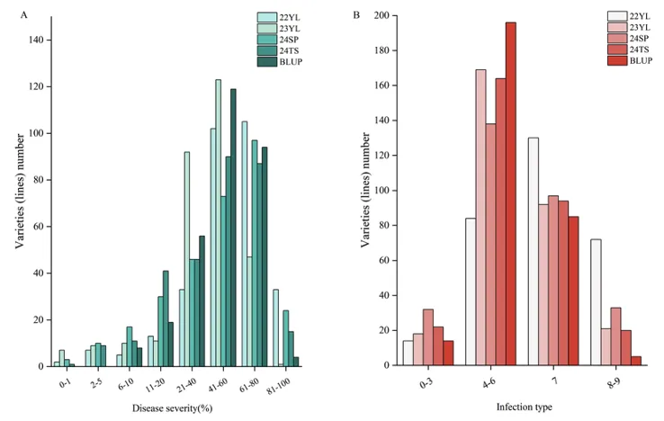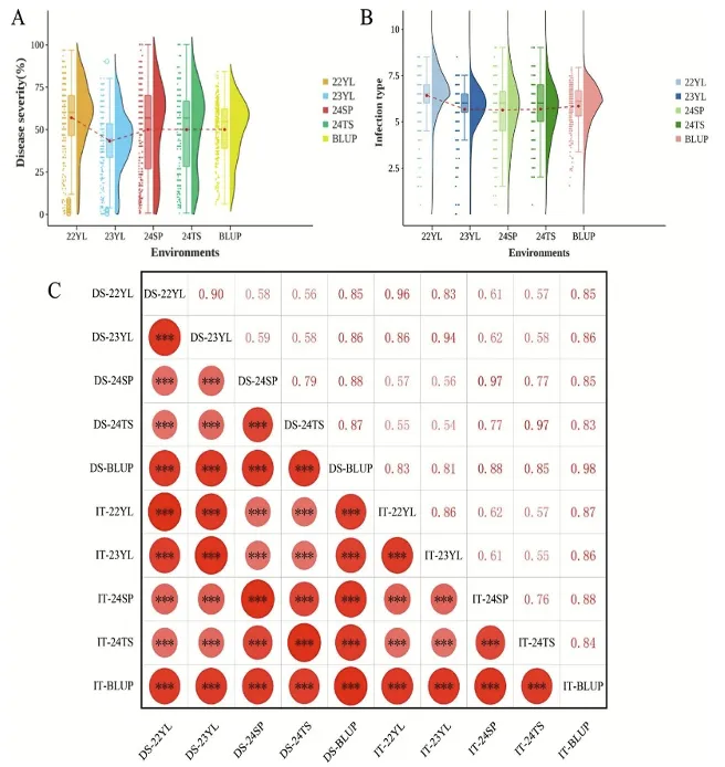 成株期抗性:四年四点(22YL、23YL、24SP、24TS)鉴定显示,不同环境下抗病性存在显著变异,但条锈病严重度(DS)和侵染型(IT)的广义遗传力均达0.89,表明抗性性状主要受遗传控制;多环境综合筛选出76份成株期稳定抗锈材料,62%左右材料在23YL、24SP环境中表现抗性(图2、3)