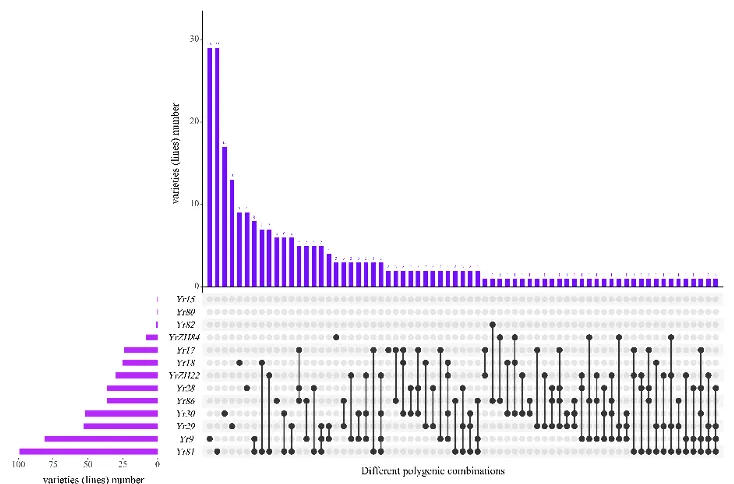 44%的材料聚合了2~5个抗锈基因,基因聚合数与病害严重度呈负相关;16%的材料(48份)不含检测的13个Yr基因,但其中川麦41等材料抗性良好,推测含有未知的有效抗锈基因(图5)
