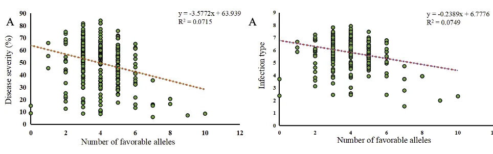 本研究基于GWAS结果开发了针对SNP位点Kukri_c2289_635的KASP标记,证明该标记可以有效地区分不同的小麦基因型。通过在小麦品种中进行基因分型,验证了该标记在分子育种中的应用价值(图8)。研究还发现,不同等位基因的表现差异在病害严重度和感染类型上具有显著差异,为未来的分子辅助育种提供了可靠的工具。