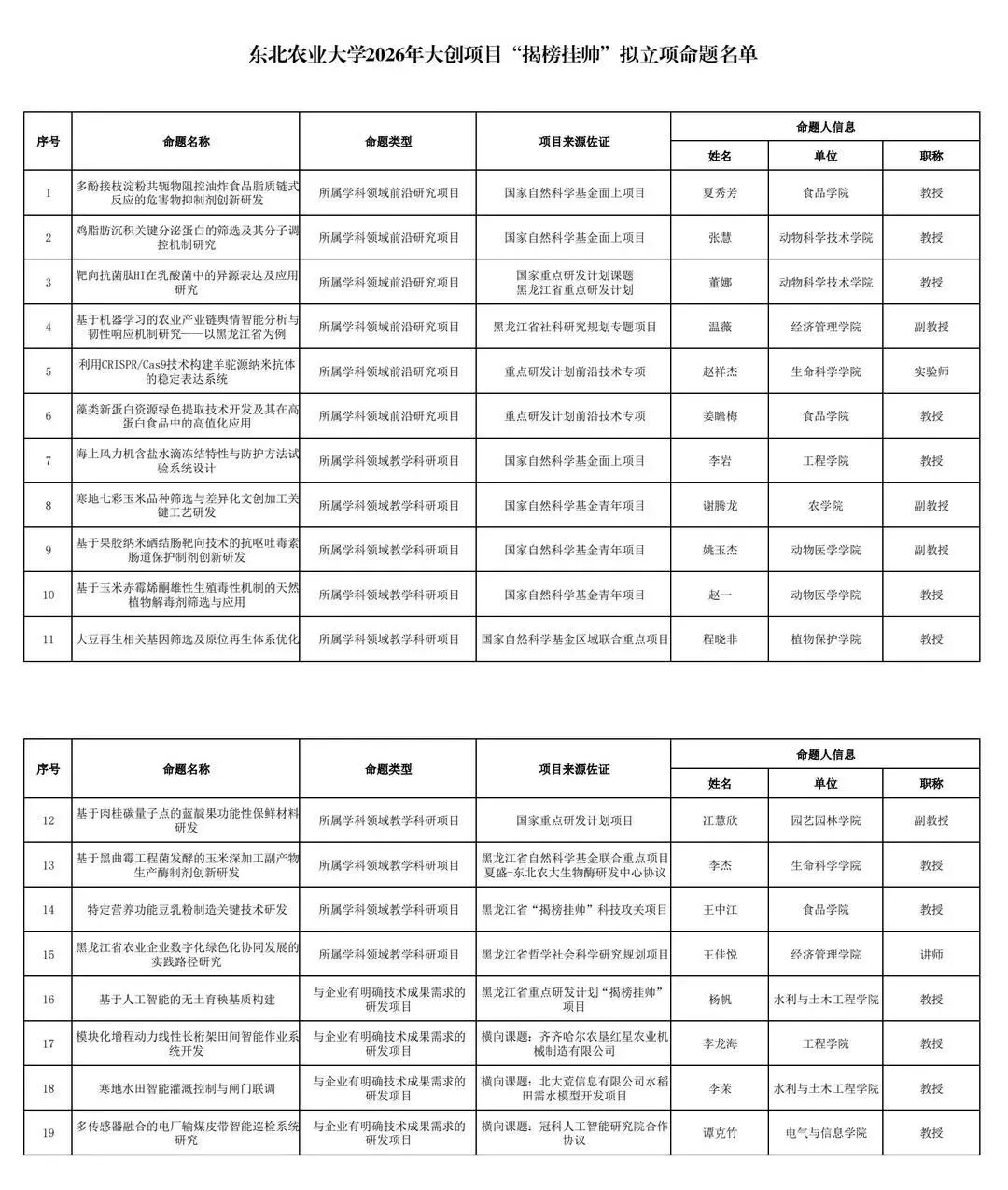 根据《东北农业大学大学生创新训练计划管理办法》相关要求,团委(创新创业中心)组织开展了2026年大学生创新训练计划“揭榜挂帅”专项命题征集工作。经命题人申报、资格审查、专家评审等流程,最终确定19个命题获得拟立项资格,现将名单予以公示。